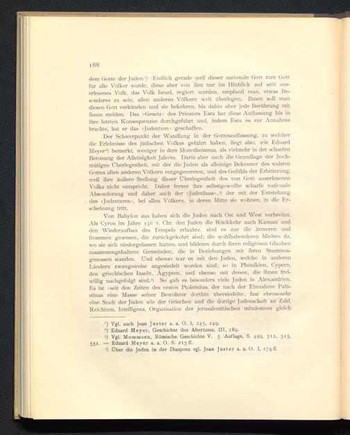 dem Gotte der Juden. 1 ) Endlich gerade weil dieser nationale Gott zum Gottfür alle Völker wurde, diese aber von ihm nur im Hinblick auf sein aus-erlesenes Volk, das Volk Israel, regiert wurden, empfand man, etwas Be-sonderes zu sein, allen anderen Völkern weit überlegen. Ihnen soll mandiesen Gott verkünden und sie bekehren, bis dahin aber jede Berührung mitihnen meiden. Das »Gesetz« des Priesters Esra hat diese Auffassung bis inihre letzten Konsequenzen durchgeführt und, indem Esra es zur Annahmebrachte, hat er das »Judentum « geschaffen.