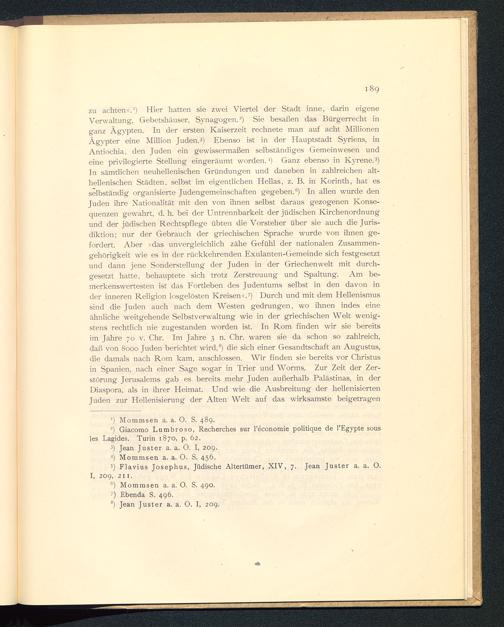zu achten«. 1 ) Hier hatten sie zwei Viertel der Stadt inne, darin eigeneVerwaltung, Gebetshäuser, Synagogen. 2 ) Sie besaßen das Bürgerrecht inganz Ägypten . In der ersten Kaiserzeit rechnete man auf acht MillionenÄgypter eine Million Juden. 3 ) Ebenso ist in der Hauptstadt Syriens , inAntiochia , den Juden ein gewissermaßen selbständiges Gemeinwesen undeine privilegierte Stellung eingeräumt worden. 4 ) Ganz ebenso in Kyrene . 5 )In sämtlichen neuhellenischen Gründungen und daneben in zahlreichen alt-hellenischen Städten, selbst im eigentlichen Hellas, z. B. in Korinth , hat esselbständig organisierte Judengemeinschaften gegeben. 6 ) In allen wurde denJuden ihre Nationalität mit den von ihnen selbst daraus gezogenen Konse-quenzen gewahrt, d. h. bei der Untrennbarkeit der jüdischen Kirchenordnungund der jüdischen Rechtspflege übten die Vorsteher über sie auch die Juris-diktion; nur der Gebrauch der griechischen Sprache wurde von ihnen ge-fordert. Aber »das unvergleichlich zähe Gefühl der nationalen Zusammen-gehörigkeit wie es in der rückkehrenden Exulanten-Gemeinde sich festgesetztund dann jene Sonderstellung der Juden in der Griechen weit mit durch-gesetzt hatte, behauptete sich trotz Zerstreuung und Spaltung. Am be-merkenswertesten ist das Fortleben des Judentums selbst in den davon inder inneren Religion losgelösten Kreisen«. 7 ) Durch und mit dem Hellenismussind die Juden auch nach dem Westen gedrungen, wo ihnen indes eineähnliche weitgehende Selbstverwaltung wie in der griechischen Welt wenig-stens rechtlich nie zugestanden worden ist. In Rom finden wir sie bereitsim Jahre 70 v. Chr. Im Jahre 3 n. Chr. waren sie da schon so zahlreich,daß von 8000 Juden berichtet wird, 8 ) die sich einer Gesandtschaft an Augustus,die damals nach Rom kam, anschlossen. Wir finden sie bereits vor Christusin Spanien, nach einer Sage sogar in Trier und Worms . Zur Zeit der Zer-störung Jerusalems gab es bereits mehr Juden außerhalb Palästinas , in derDiaspora, als in ihrer Heimat. Und wie die Ausbreitung der hellenisiertenJuden zur Hellenisierung der Alten Welt auf das wirksamste beigetragen