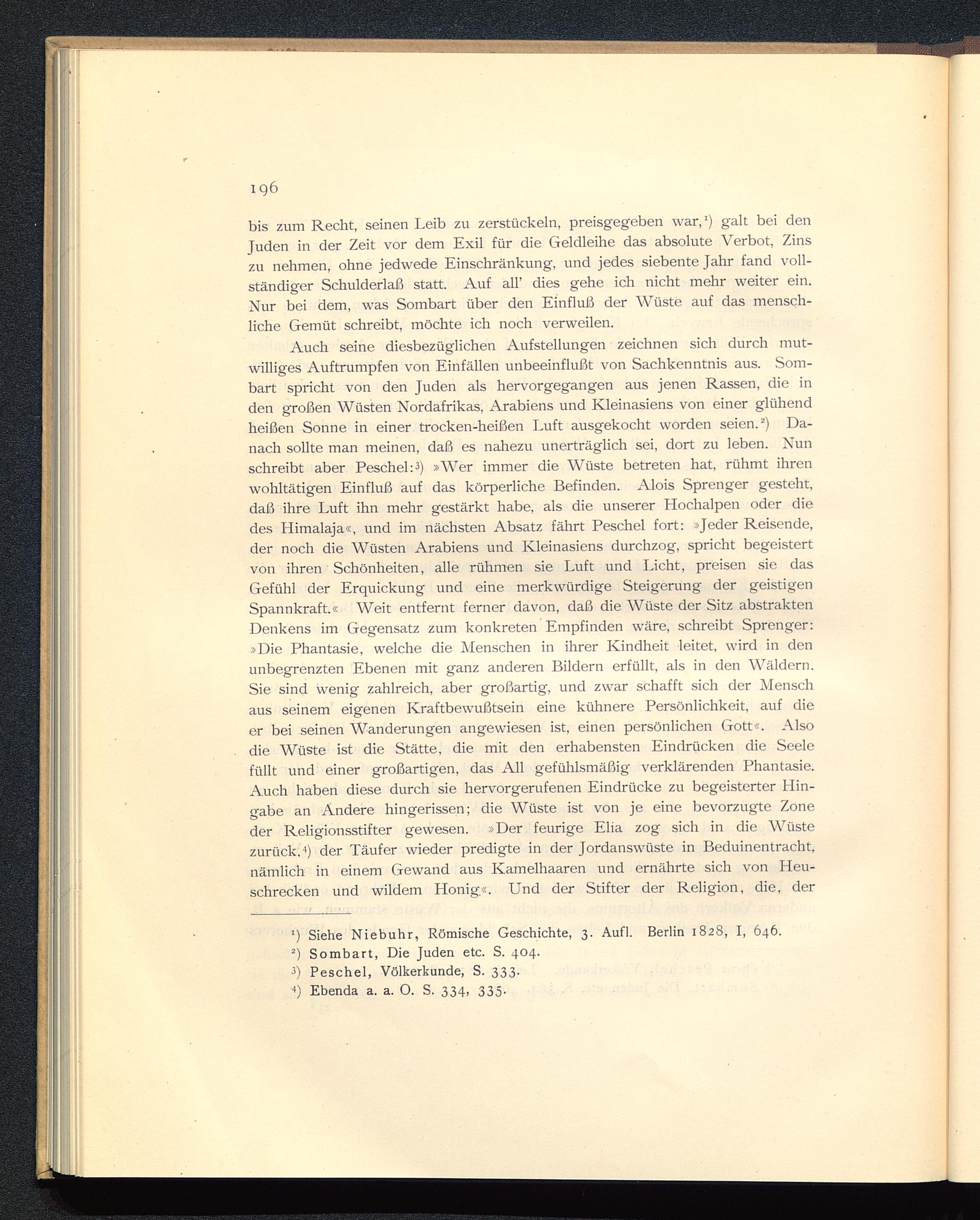 Auch seine diesbezüglichen Aufstellungen zeichnen sich durch mut-williges Auftrumpfen von Einfällen unbeeinflußt von Sachkenntnis aus. Som-bart spricht von den Juden als hervorgegangen aus jenen Rassen, die inden großen Wüsten Nordafrikas, Arabiens und Kleinasiens von einer glühendheißen Sonne in einer trocken-heißen Luft ausgekocht worden seien. * 2 ) Da-nach sollte man meinen, daß es nahezu unerträglich sei, dort zu leben. Nunschreibt aber Peschei: 3 ) »Wer immer die Wüste betreten hat, rühmt ihrenwohltätigen Einfluß auf das körperliche Befinden. Alois Sprenger gesteht,daß ihre Luft ihn mehr gestärkt habe, als die unserer Hochalpen oder diedes Himalaja «, und im nächsten Absatz fährt Peschei fort: »Jeder Reisende,der noch die Wüsten Arabiens und Kleinasiens durchzog, spricht begeistertvon ihren Schönheiten, alle rühmen sie Luft und Licht, preisen sie dasGefühl der Erquickung und eine merkwürdige Steigerung der geistigenSpannkraft.« Weit entfernt ferner davon, daß die Wüste der Sitz abstraktenDenkens im Gegensatz zum konkreten Empfinden wäre, schreibt Sprenger:»Die Phantasie, welche die Menschen in ihrer Kindheit leitet, wird in denunbegrenzten Ebenen mit ganz anderen Bildern erfüllt, als in den Wäldern.Sie sind wenig zahlreich, aber großartig, und zwar schafft sich der Menschaus seinem eigenen Kraftbewußtsein eine kühnere Persönlichkeit, auf dieer bei seinen Wanderungen angewiesen ist, einen persönlichen Gott«. Alsodie Wüste ist die Stätte, die mit den erhabensten Eindrücken die Seelefüllt und einer großartigen, das All gefühlsmäßig verklärenden Phantasie.Auch haben diese durch sie hervorgerufenen Eindrücke zu begeisterter Hin-gabe an Andere hingerissen; die Wüste ist von je eine bevorzugte Zoneder Religionsstifter gewesen. »Der feurige Elia zog sich in die Wüstezurück, 4 ) der Täufer wieder predigte in der Jordanswüste in Beduinentracht,nämlich in einem Gewand aus Kamelhaaren und ernährte sich von Heu-schrecken und wildem Honig«. Und der Stifter der Religion, die, der