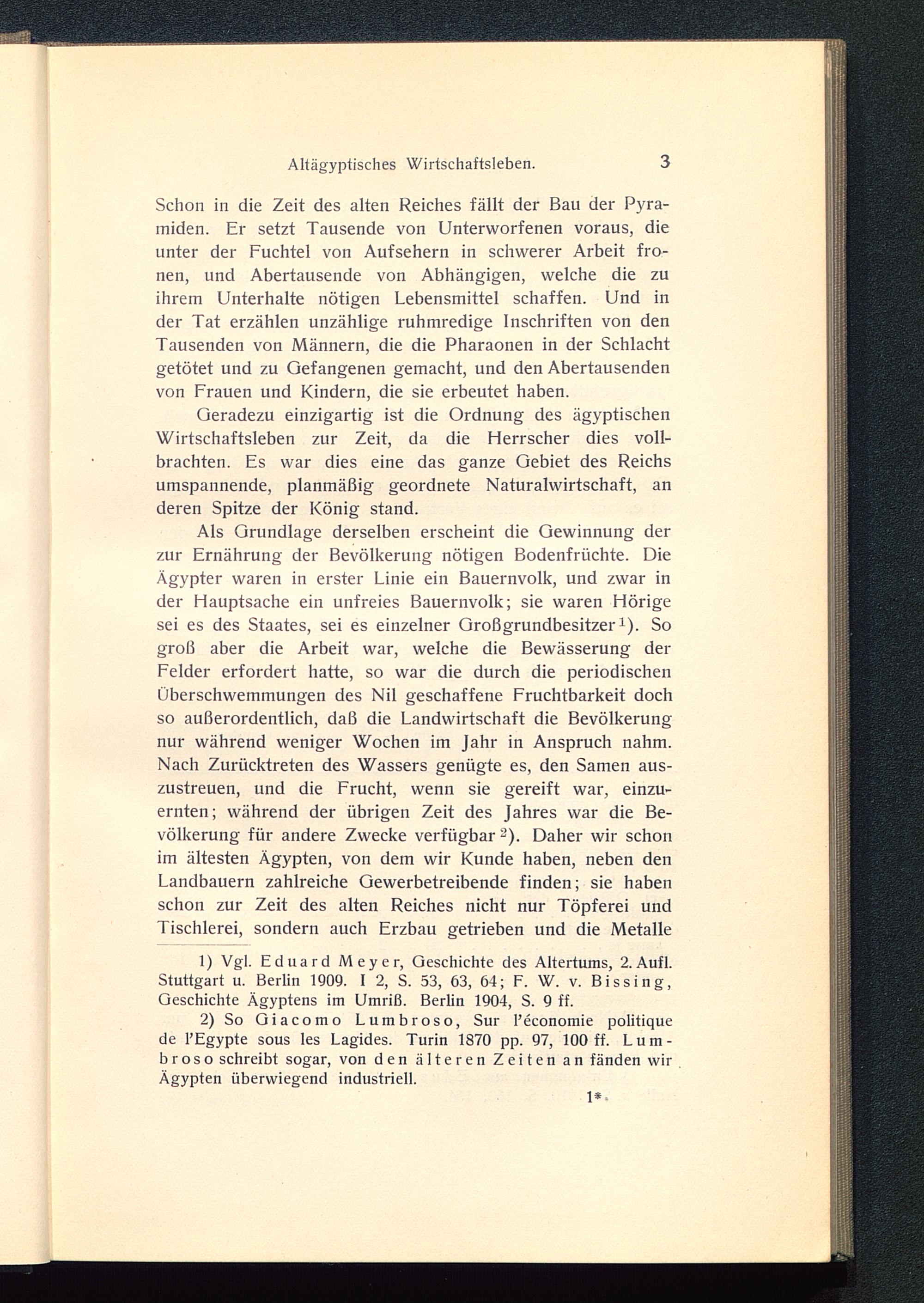 Als Grundlage derselben erscheint die Gewinnung derzur Ernährung der Bevölkerung nötigen Bodenfrüchte. DieÄgypter waren in erster Linie ein Bauernvolk, und zwar inder Hauptsache ein unfreies Bauernvolk; sie waren Hörigesei es des Staates, sei es einzelner Großgrundbesitzer 1 ). Sogroß aber die Arbeit war, welche die Bewässerung derFelder erfordert hatte, so war die durch die periodischenÜberschwemmungen des Nil geschaffene Fruchtbarkeit dochso außerordentlich, daß die Landwirtschaft die Bevölkerungnur während weniger Wochen im Jahr in Anspruch nahm.Nach Zurücktreten des Wassers genügte es, den Samen aus-zustreuen, und die Frucht, wenn sie gereift war, einzu-ernten; während der übrigen Zeit des Jahres war die Be-völkerung für andere Zwecke verfügbar 2 ). Daher wir schonim ältesten Ägypten, von dem wir Kunde haben, neben denLandbauern zahlreiche Gewerbetreibende finden; sie habenschon zur Zeit des alten Reiches nicht nur Töpferei undTischlerei, sondern auch Erzbau getrieben und die Metalle