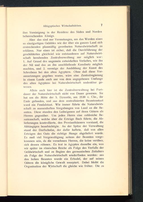 Aber das sind nur Vermutungen, um das Werden einesso einzigartigen Gebildes wie der über ein ganzes Land sicherstreckenden planmäßig geordneten Naturalwirtschaft zuerklären. Nur eines ist sicher, daß die Durchführung dergeschilderten gleichviel wie entstandenen auf Naturalwirt-schaft beruhenden Zentralverwaltung nur möglich war:1. Auf Grund des ungemein entwickelten Verkehrs, wie ihnder Nil und das an ihn anschließende Kanalnetz möglichmachten, und 2. vermöge der Ausbildung der Kunst desSchreibens bei den alten Ägyptern. Ohne daß diese Vor-aussetzungen gegeben waren, wäre eine Zentralregierungin einem Lande auch nur von dem angegebenen Umfangedes alten Ägyptens bei Naturalwirtschaft undenkbar ge-wesen.