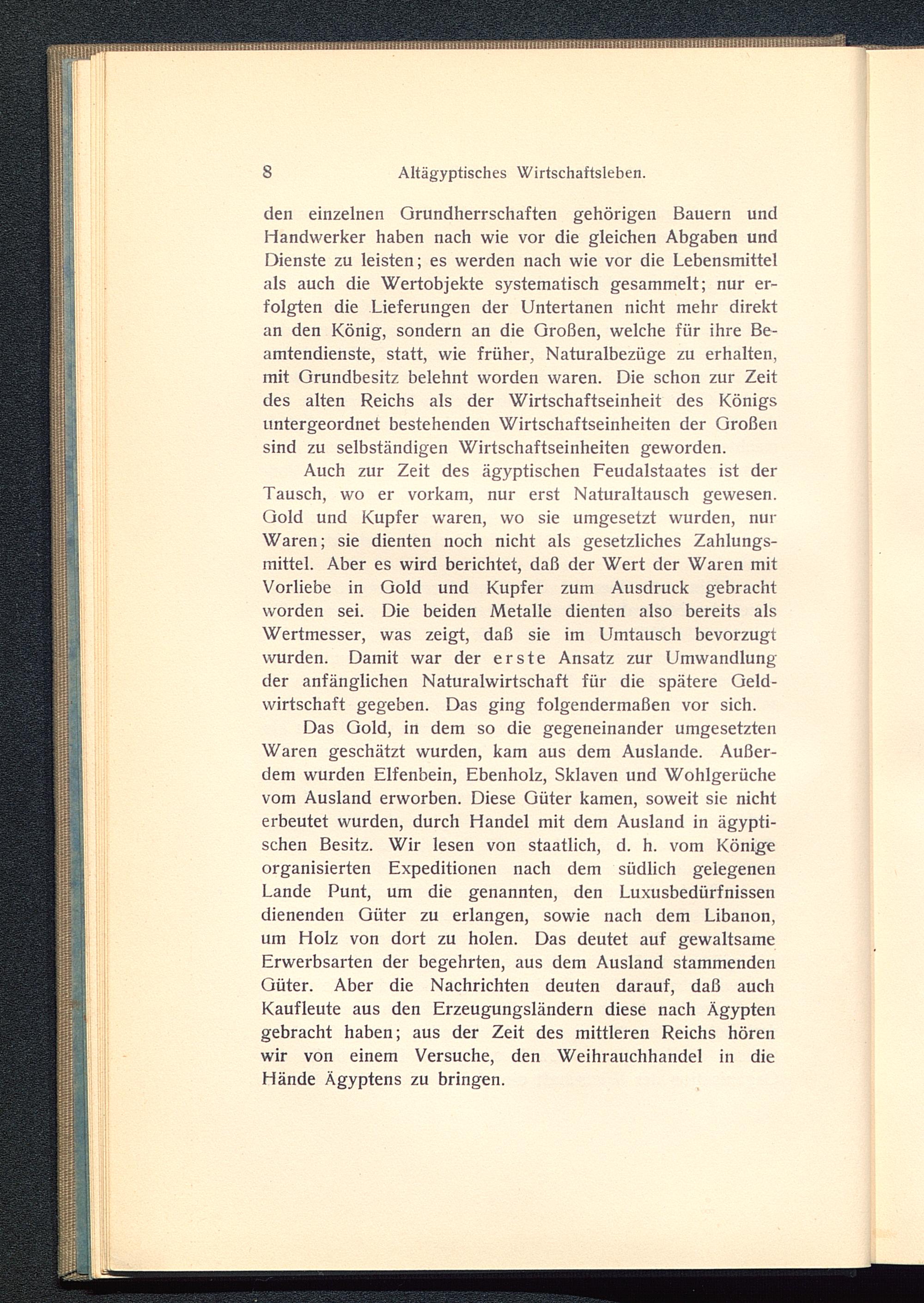 Das Gold, in dem so die gegeneinander umgesetztenWaren geschätzt wurden, kam aus dem Auslande. Außer-dem wurden Elfenbein, Ebenholz, Sklaven und Wohlgerüchevom Ausland erworben. Diese Güter kamen, soweit sie nichterbeutet wurden, durch Handel mit dem Ausland in ägypti-schen Besitz. Wir lesen von staatlich, d. h. vom Königeorganisierten Expeditionen nach dem südlich gelegenenLande Punt, um die genannten, den Luxusbedürfnissendienenden Güter zu erlangen, sowie nach dem Libanon,um Holz von dort zu holen. Das deutet auf gewaltsameErwerbsarten der begehrten, aus dem Ausland stammendenGüter. Aber die Nachrichten deuten darauf, daß auchKaufleute aus den Erzeugungsländern diese nach Ägypten gebracht haben; aus der Zeit des mittleren Reichs hörenwir von einem Versuche, den Weihrauchhandel in dieHände Ägyptens zu bringen.