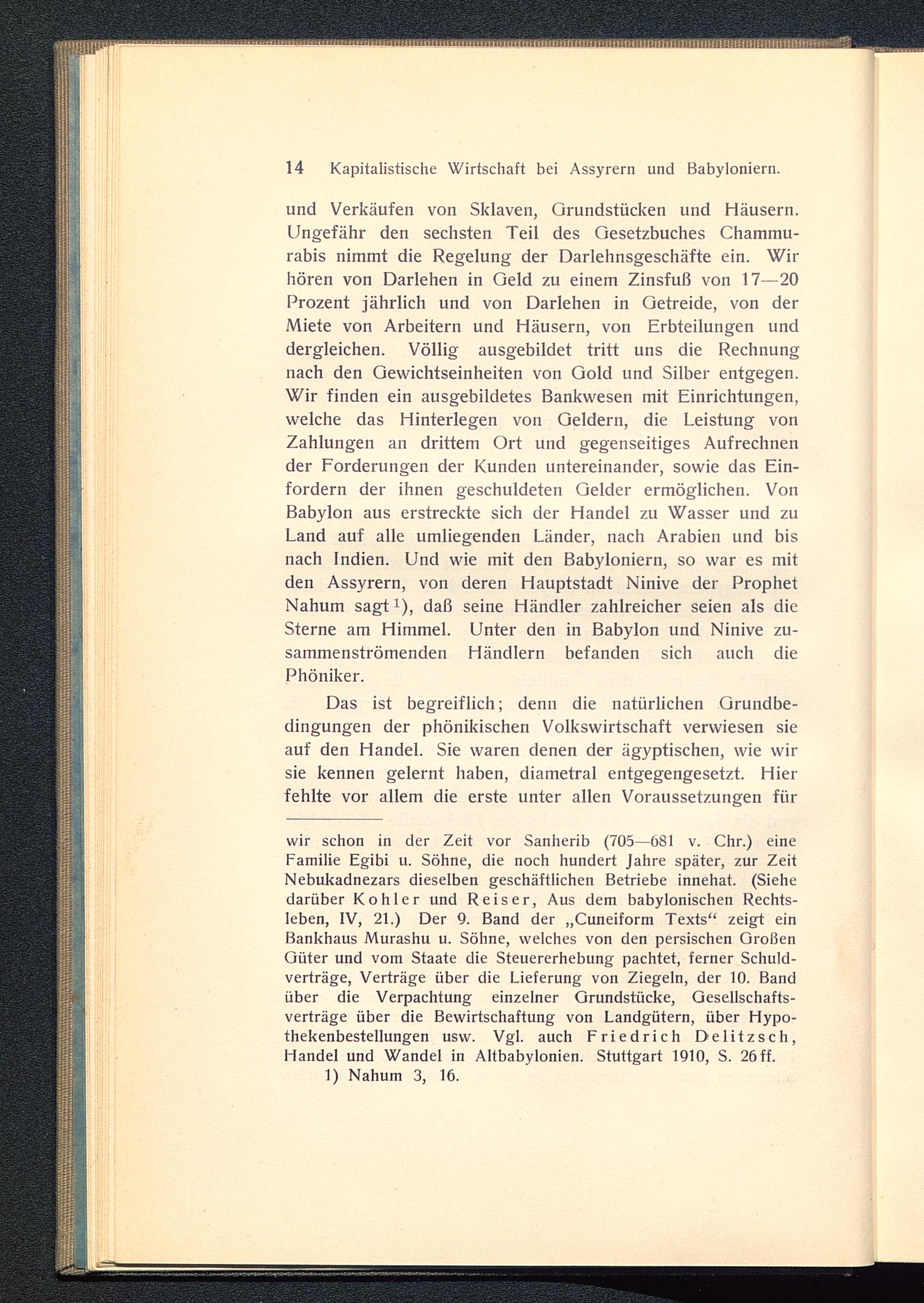 und Verkäufen von Sklaven, Grundstücken und Häusern.Ungefähr den sechsten Teil des Gesetzbuches Chammu-rabis nimmt die Regelung der Darlehnsgeschäfte ein. Wirhören von Darlehen in Geld zu einem Zinsfuß von 17—20Prozent jährlich und von Darlehen in Getreide, von derMiete von Arbeitern und Häusern, von Erbteilungen unddergleichen. Völlig ausgebildet tritt uns die Rechnungnach den Gewichtseinheiten von Gold und Silber entgegen.Wir finden ein ausgebildetes Bankwesen mit Einrichtungen,welche das Hinterlegen von Geldern, die Leistung vonZahlungen an drittem Ort und gegenseitiges Aufrechnender Forderungen der Kunden untereinander, sowie das Ein-fordern der ihnen geschuldeten Gelder ermöglichen. VonBabylon aus erstreckte sich der Handel zu Wasser und zuLand auf alle umliegenden Länder, nach Arabien und bisnach Indien. Und wie mit den Babyloniern, so war es mitden Assyrern, von deren Hauptstadt Ninive der ProphetNahum sagt*), daß seine Händler zahlreicher seien als dieSterne am Himmel. Unter den in Babylon und Ninive zu-sammenströmenden Händlern befanden sich auch diePhöniker.