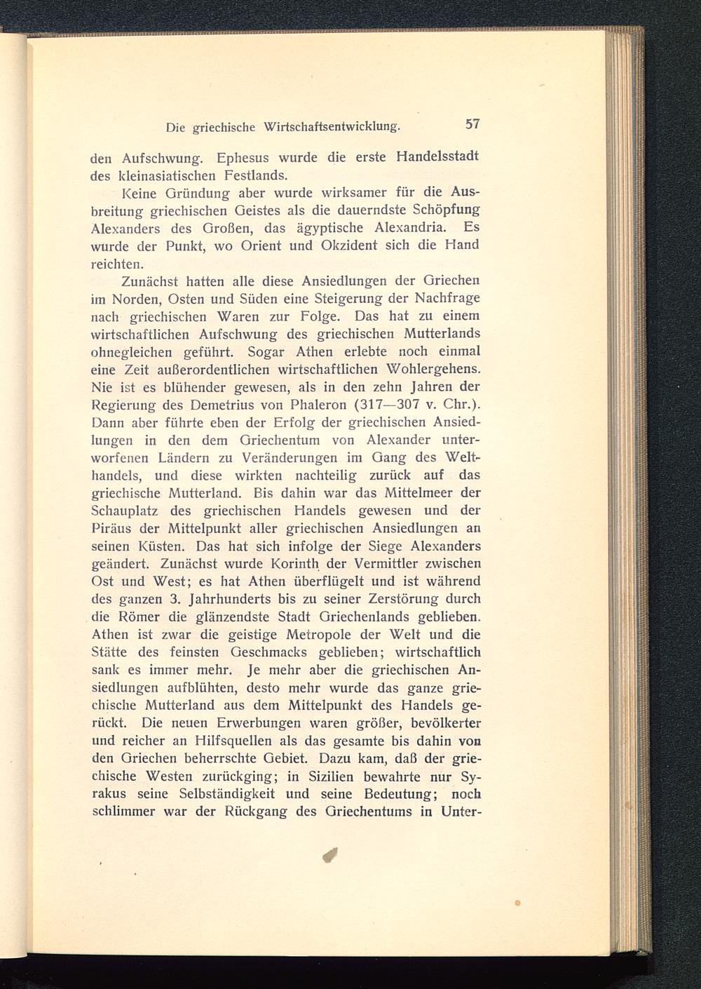 Zunächst hatten alle diese Ansiedlungen der Griechenim Norden, Osten und Süden eine Steigerung der Nachfragenach griechischen Waren zur Folge. Das hat zu einemwirtschaftlichen Aufschwung des griechischen Mutterlandsohnegleichen geführt. Sogar Athen erlebte noch einmaleine Zeit außerordentlichen wirtschaftlichen Wohlergehens.Nie ist es blühender gewesen, als in den zehn Jahren derRegierung des Demetrius von Phaleron (317—307 v. Chr.).Dann aber führte eben der Erfolg der griechischen Ansied-lungen in den dem Griechentum von Alexander unter-worfenen Ländern zu Veränderungen im Gang des Welt-handels, und diese wirkten nachteilig zurück auf dasgriechische Mutterland. Bis dahin war das Mittelmeer derSchauplatz des griechischen Handels gewesen und derPiräus der Mittelpunkt aller griechischen Ansiedlungen anseinen Küsten. Das hat sich infolge der Siege Alexandersgeändert. Zunächst wurde Korinth der Vermittler zwischenOst und West; es hat Athen überflügelt und ist währenddes ganzen 3. Jahrhunderts bis zu seiner Zerstörung durchdie Römer die glänzendste Stadt Griechenlands geblieben.Athen ist zwar die geistige Metropole der Welt und dieStätte des feinsten Geschmacks geblieben; wirtschaftlichsank es immer mehr. Je mehr aber die griechischen An-siedlungen aufblühten, desto mehr wurde das ganze grie-chische Mutterland aus dem Mittelpunkt des Handels ge-rückt. Die neuen Erwerbungen waren größer, bevölkerterund reicher an Hilfsquellen als das gesamte bis dahin vonden Griechen beherrschte Gebiet. Dazu kam, daß der grie-chische Westen zurückging; in Sizilien bewahrte nur Sy-rakus seine Selbständigkeit und seine Bedeutung; nochschlimmer war der Rückgang des Griechentums in Unter-