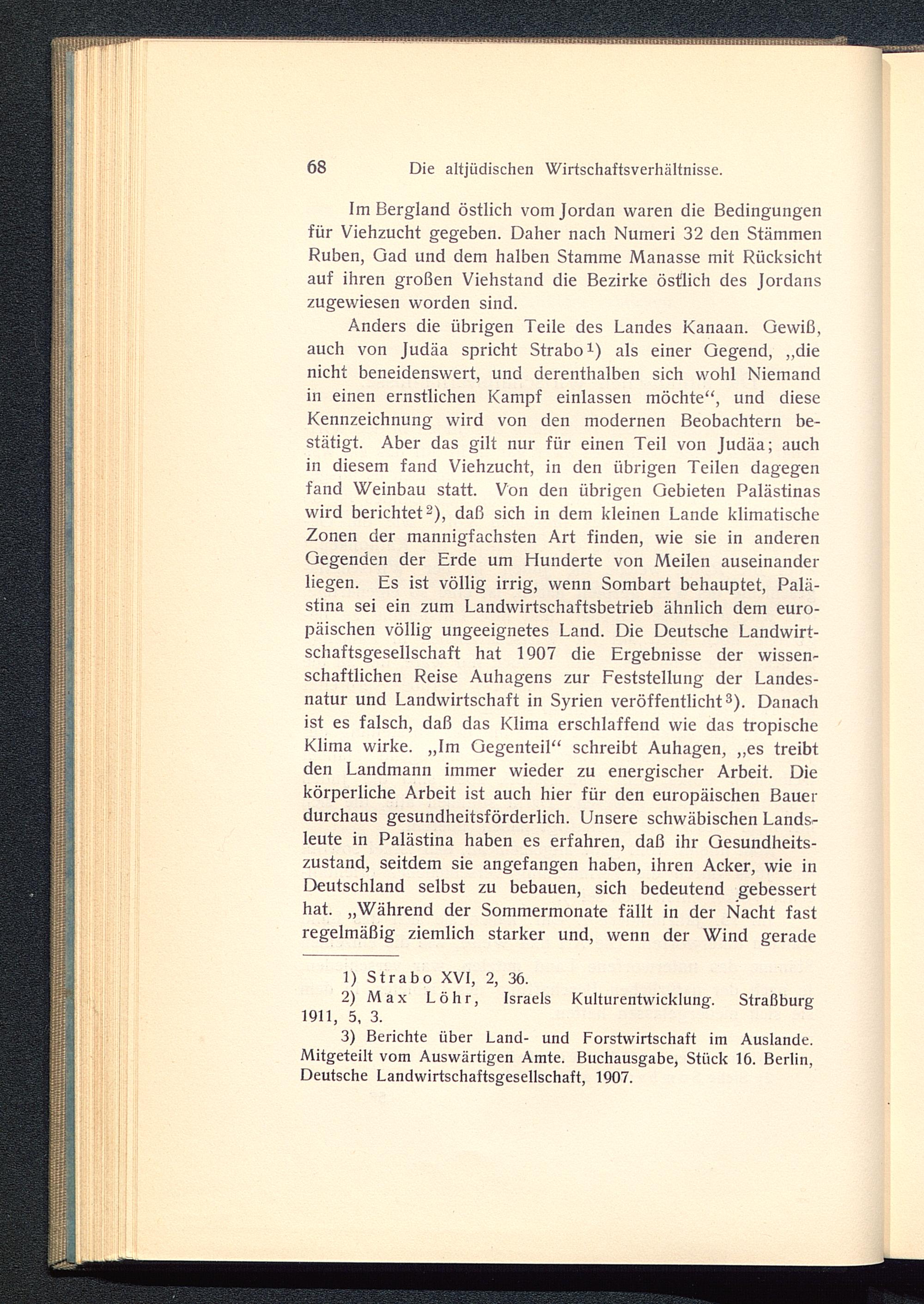 Anders die übrigen Teile des Landes Kanaan . Gewiß,auch von Judäa spricht Strabo 1 ) als einer Gegend, „dienicht beneidenswert, und derenthalben sich wohl Niemandin einen ernstlichen Kampf einlassen möchte“, und dieseKennzeichnung wird von den modernen Beobachtern be-stätigt. Aber das gilt nur für einen Teil von Judäa ; auchin diesem fand Viehzucht, in den übrigen Teilen dagegenfand Weinbau statt. Von den übrigen Gebieten Palästinas wird berichtet 2 ), daß sich in dem kleinen Lande klimatischeZonen der mannigfachsten Art finden, wie sie in anderenGegenden der Erde um Hunderte von Meilen auseinanderliegen. Es ist völlig irrig, wenn Sombart behauptet, Palä-stina sei ein zum Landwirtschaftsbetrieb ähnlich dem euro-päischen völlig ungeeignetes Land. Die Deutsche Landwirt-schaftsgesellschaft hat 1907 die Ergebnisse der wissen-schaftlichen Reise Auhagens zur Feststellung der Landes-natur und Landwirtschaft in Syrien veröffentlicht 3 ). Danachist es falsch, daß das Klima erschlaffend wie das tropischeKlima wirke. „Im Gegenteil“ schreibt Auhagen, „es treibtden Landmann immer wieder zu energischer Arbeit. Diekörperliche Arbeit ist auch hier für den europäischen Bauerdurchaus gesundheitsförderlich. Unsere schwäbischen Lands-leute in Palästina haben es erfahren, daß ihr Gesundheits-zustand, seitdem sie angefangen haben, ihren Acker, wie inDeutschland selbst zu bebauen, sich bedeutend gebesserthat. „Während der Sommermonate fällt in der Nacht fastregelmäßig ziemlich starker und, wenn der Wind gerade