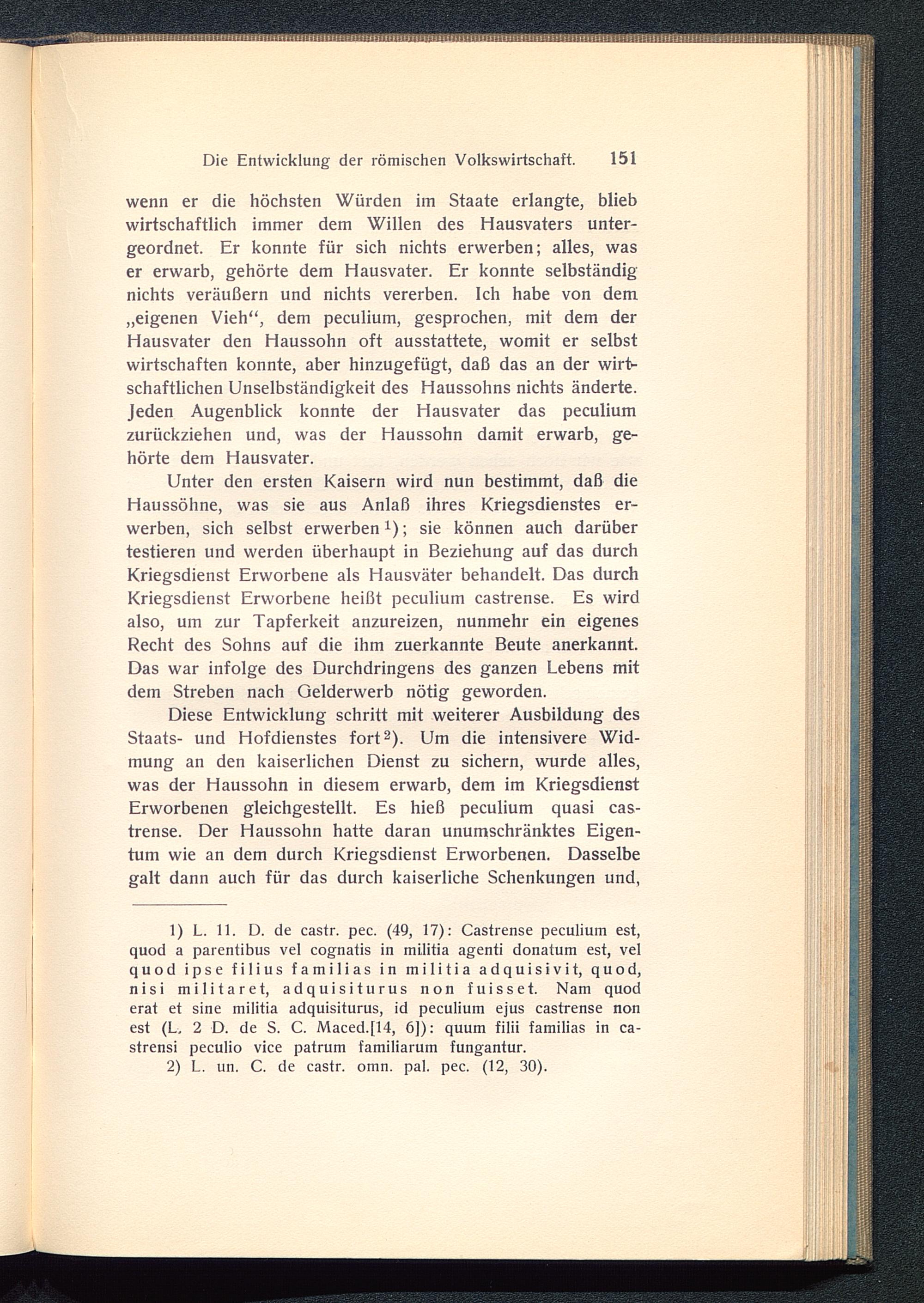 wenn er die höchsten Würden im Staate erlangte, bliebwirtschaftlich immer dem Willen des Hausvaters unter-geordnet. Er konnte für sich nichts erwerben; alles, waser erwarb, gehörte dem Hausvater. Er konnte selbständignichts veräußern und nichts vererben. Ich habe von dem„eigenen Vieh“, dem peculium, gesprochen, mit dem derHausvater den Haussohn oft ausstattete, womit er selbstwirtschaften konnte, aber hinzugefügt, daß das an der wirt-schaftlichen Unselbständigkeit des Haussohns nichts änderte.Jeden Augenblick konnte der Hausvater das peculiumzurückziehen und, was der Haussohn damit erwarb, ge-hörte dem Hausvater.