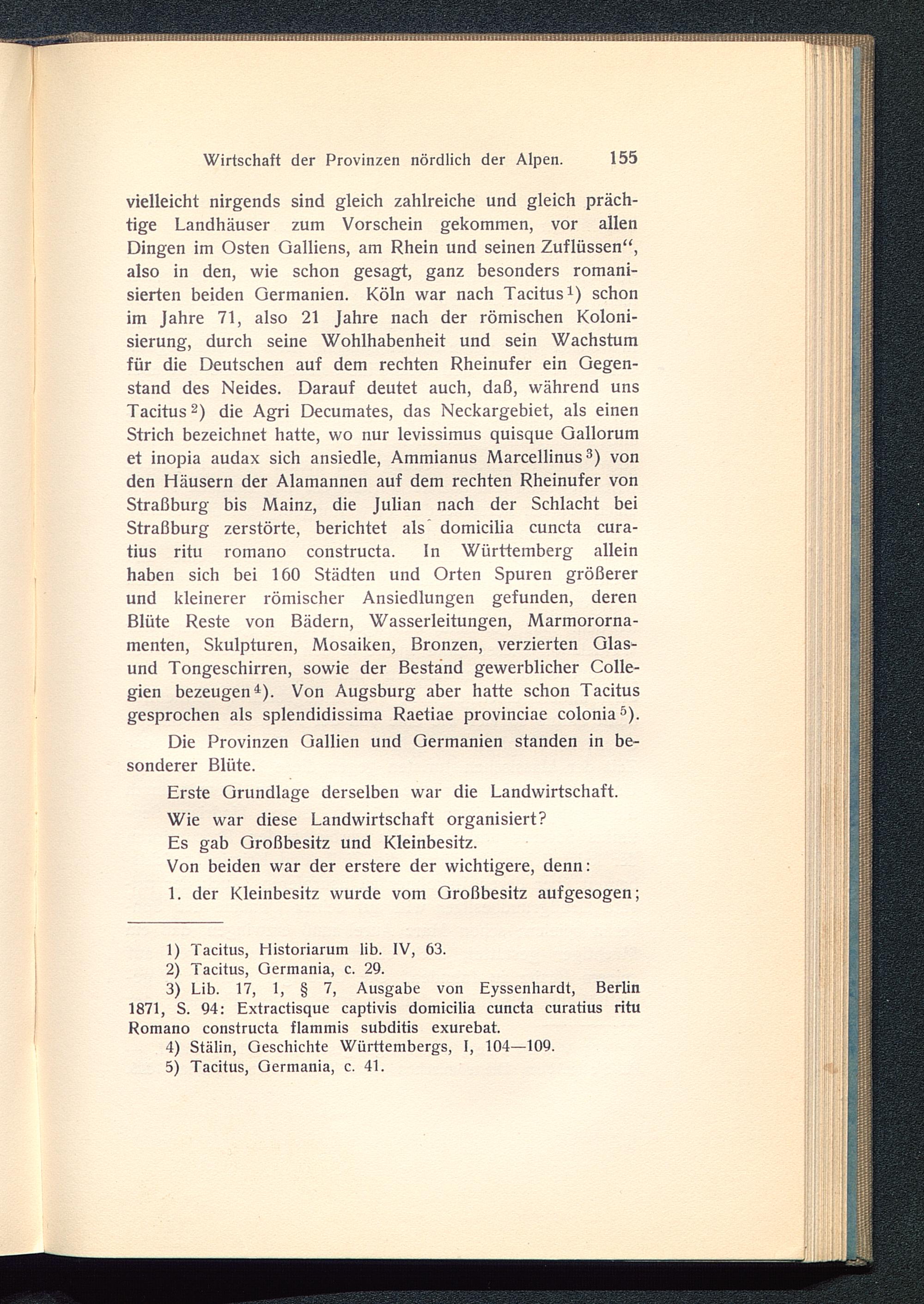 vielleicht nirgends sind gleich zahlreiche und gleich präch-tige Landhäuser zum Vorschein gekommen, vor allenDingen im Osten Galliens, am Rhein und seinen Zuflüssen“,also in den, wie schon gesagt, ganz besonders romani-sierten beiden Germanien. Köln war nach Tacitus 1 ) schonim Jahre 71, also 21 Jahre nach der römischen Koloni-sierung, durch seine Wohlhabenheit und sein Wachstumfür die Deutschen auf dem rechten Rheinufer ein Gegen-stand des Neides. Darauf deutet auch, daß, während unsTacitus 2 ) die Agri Decumates, das Neckargebiet, als einenStrich bezeichnet hatte, wo nur levissimus quisque Gallorumet inopia audax sich ansiedle, Ammianus Marcellinus 3 ) vonden Häusern der Alamannen auf dem rechten Rheinufer vonStraßburg bis Mainz , die Julian nach der Schlacht beiStraßburg zerstörte, berichtet als domicilia cuncta cura-tius ritu romano constructa. ln Württemberg alleinhaben sich bei 160 Städten und Orten Spuren größererund kleinerer römischer Ansiedlungen gefunden, derenBlüte Reste von Bädern, Wasserleitungen, Marmororna-menten, Skulpturen, Mosaiken, Bronzen, verzierten Glas-und Tongeschirren, sowie der Bestand gewerblicher Colle-gien bezeugen 4 ). Von Augsburg aber hatte schon Tacitusgesprochen als splendidissima Raetiae provinciae colonia 5 ).