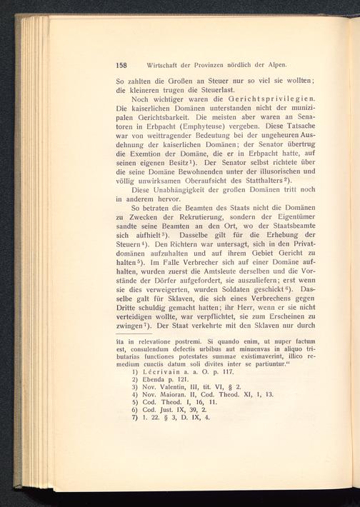 Noch wichtiger waren die Gerichtsprivilegien.Die kaiserlichen Domänen unterstanden nicht der munizi-palen Gerichtsbarkeit. Die meisten aber waren an Sena-toren in Erbpacht (Emphyteuse) vergeben. Diese Tatsachewar von weittragender Bedeutung bei der ungeheuren Aus-dehnung der kaiserlichen Domänen; der Senator übertrugdie Exemtion der Domäne, die er in Erbpacht hatte, aufseinen eigenen Besitz * 1 ). Der Senator selbst richtete überdie seine Domäne Bewohnenden unter der illusorischen undvöllig unwirksamen Oberaufsicht des Statthalters 2 ).