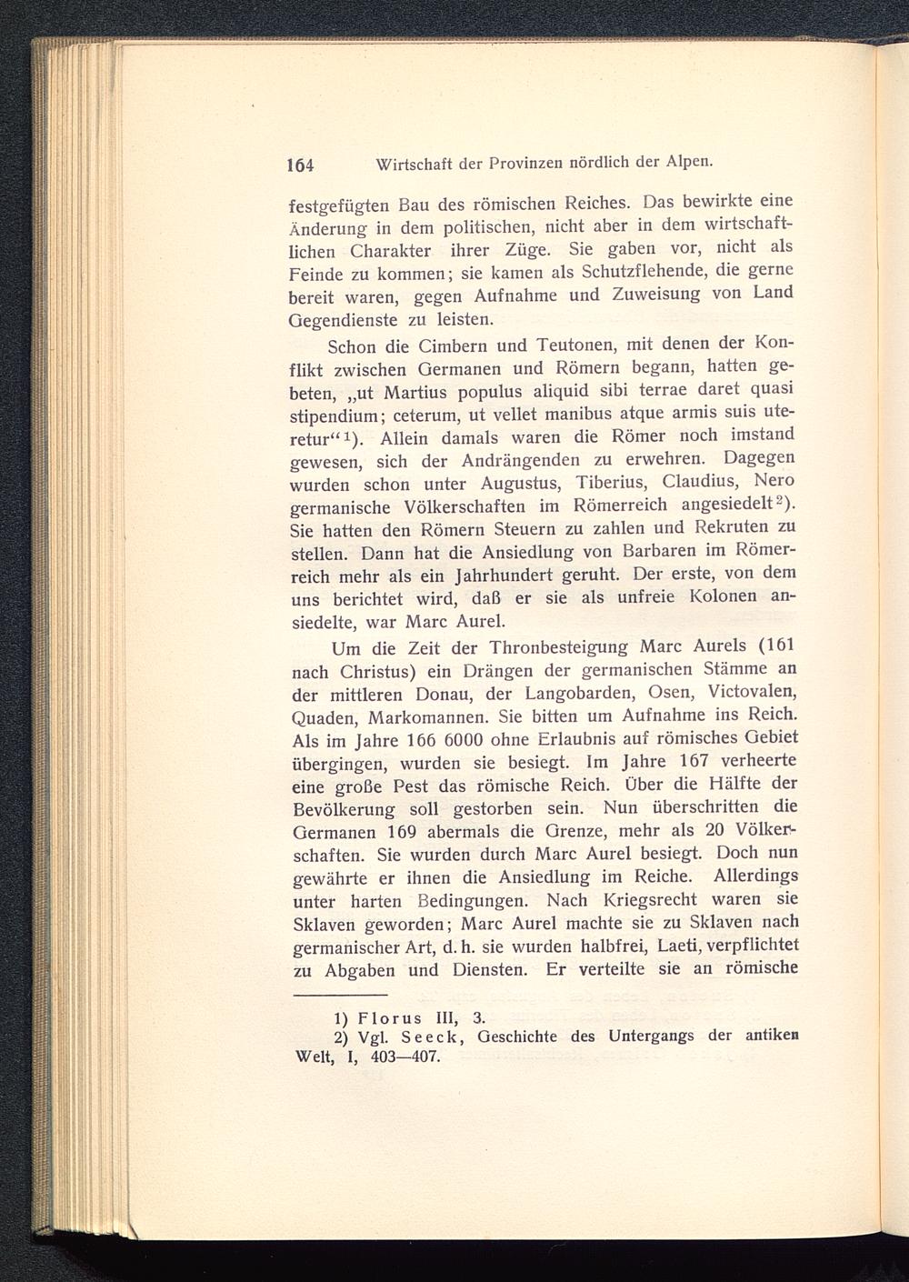 Schon die Cimbern und Teutonen, mit denen der Kon-flikt zwischen Germanen und Römern begann, hatten ge-beten, „ut Martius populus aliquid sibi terrae daret quasiStipendium; ceterum, ut vellet manibus atque armis suis ute-retur“ 1 ). Allein damals waren die Römer noch imstandgewesen, sich der Andrängenden zu erwehren. Dagegenwurden schon unter Augustus, Tiberius , Claudius, Nerogermanische Völkerschaften im Römerreich angesiedelt 2 ).Sie hatten den Römern Steuern zu zahlen und Rekruten zustellen. Dann hat die Ansiedlung von Barbaren im Römer-reich mehr als ein Jahrhundert geruht. Der erste, von demuns berichtet wird, daß er sie als unfreie Kolonen an-siedelte, war Marc Aurel .