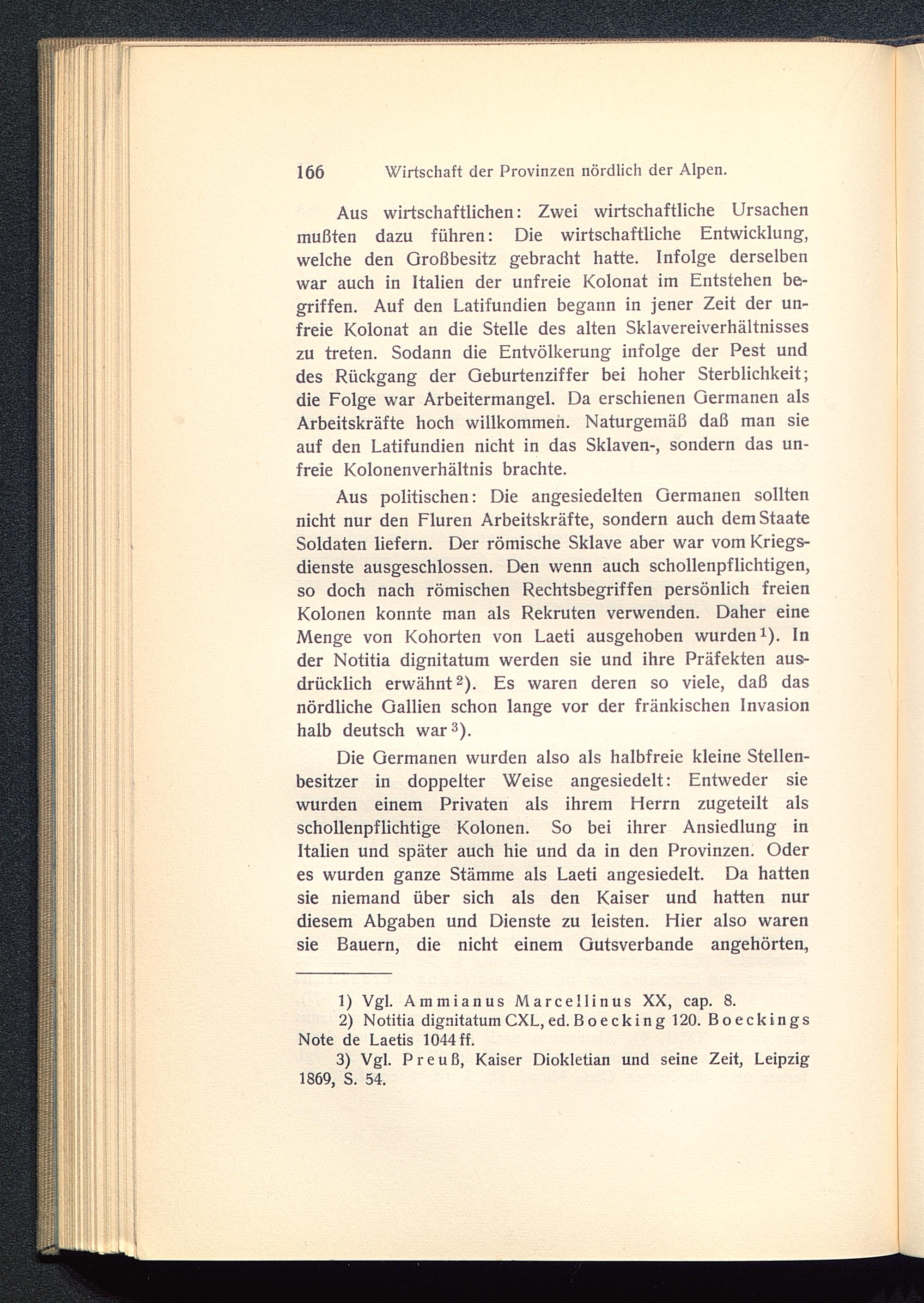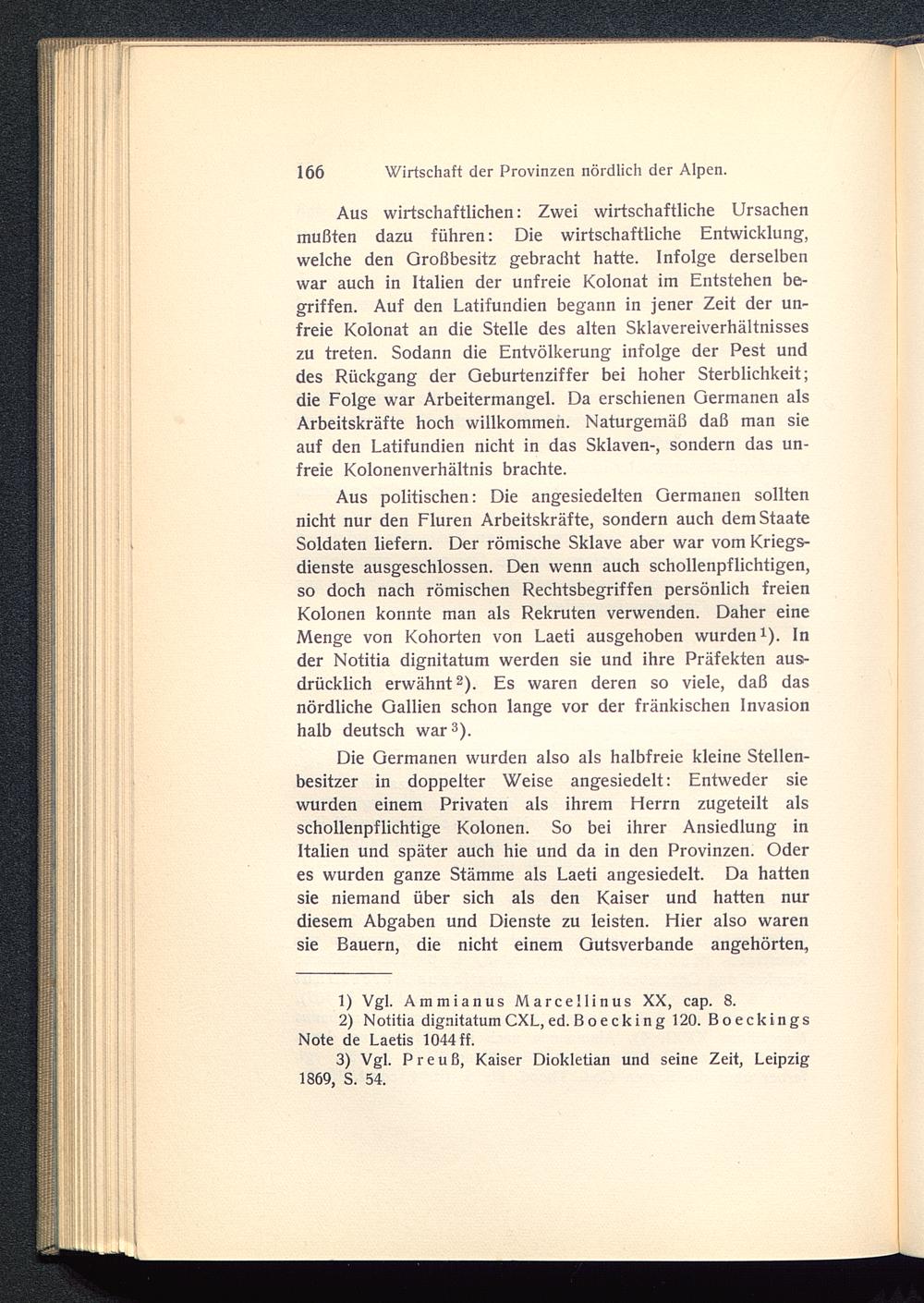 Aus politischen: Die angesiedelten Germanen solltennicht nur den Fluren Arbeitskräfte, sondern auch dem StaateSoldaten liefern. Der römische Sklave aber war vom Kriegs-dienste ausgeschlossen. Den wenn auch schollenpflichtigen,so doch nach römischen Rechtsbegriffen persönlich freienKolonen konnte man als Rekruten verwenden. Daher eineMenge von Kohorten von Laeti ausgehoben wurden 1 ). Inder Notitia dignitatum werden sie und ihre Präfekten aus-drücklich erwähnt 2 ). Es waren deren so viele, daß dasnördliche Gallien schon lange vor der fränkischen Invasionhalb deutsch war 3 ).