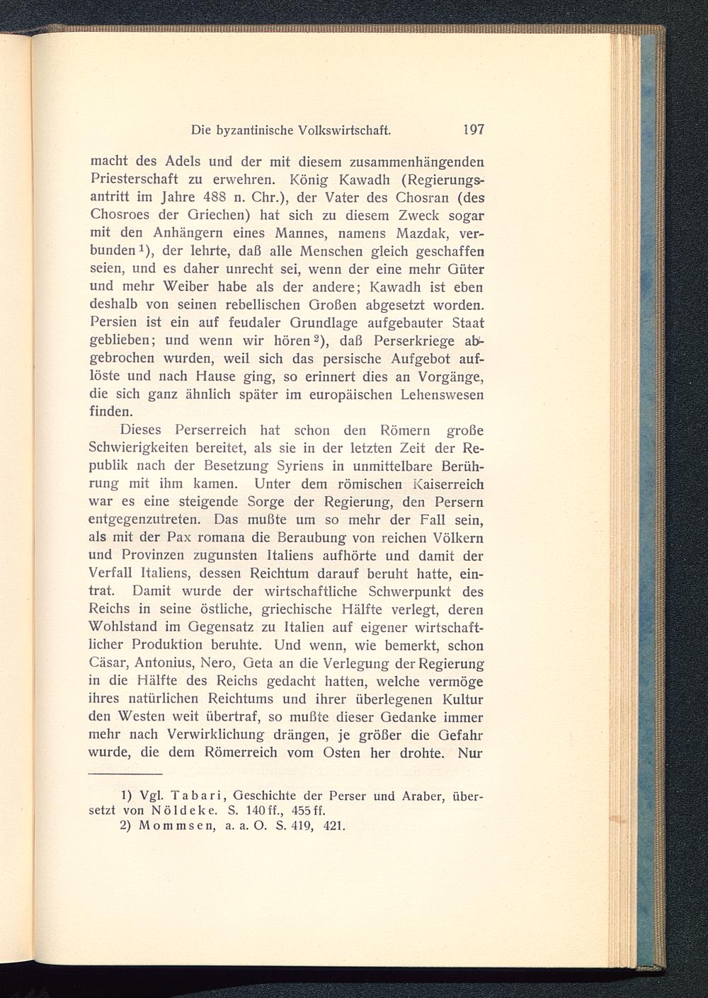 macht des Adels und der mit diesem zusammenhängendenPriesterschaft zu erwehren. König Kawadh (Regierungs-antritt im Jahre 488 n. Chr.), der Vater des Chosran (desChosroes der Griechen) hat sich zu diesem Zweck sogarmit den Anhängern eines Mannes, namens Mazdak, ver-bunden 1 ), der lehrte, daß alle Menschen gleich geschaffenseien, und es daher unrecht sei, wenn der eine mehr Güterund mehr Weiber habe als der andere; Kawadh ist ebendeshalb von seinen rebellischen Großen abgesetzt worden.Persien ist ein auf feudaler Grundlage aufgebauter Staatgeblieben; und wenn wir hören 2 ), daß Perserkriege ab-gebrochen wurden, weil sich das persische Aufgebot auf-löste und nach Hause ging, so erinnert dies an Vorgänge,die sich ganz ähnlich später im europäischen Lehenswesenfinden.