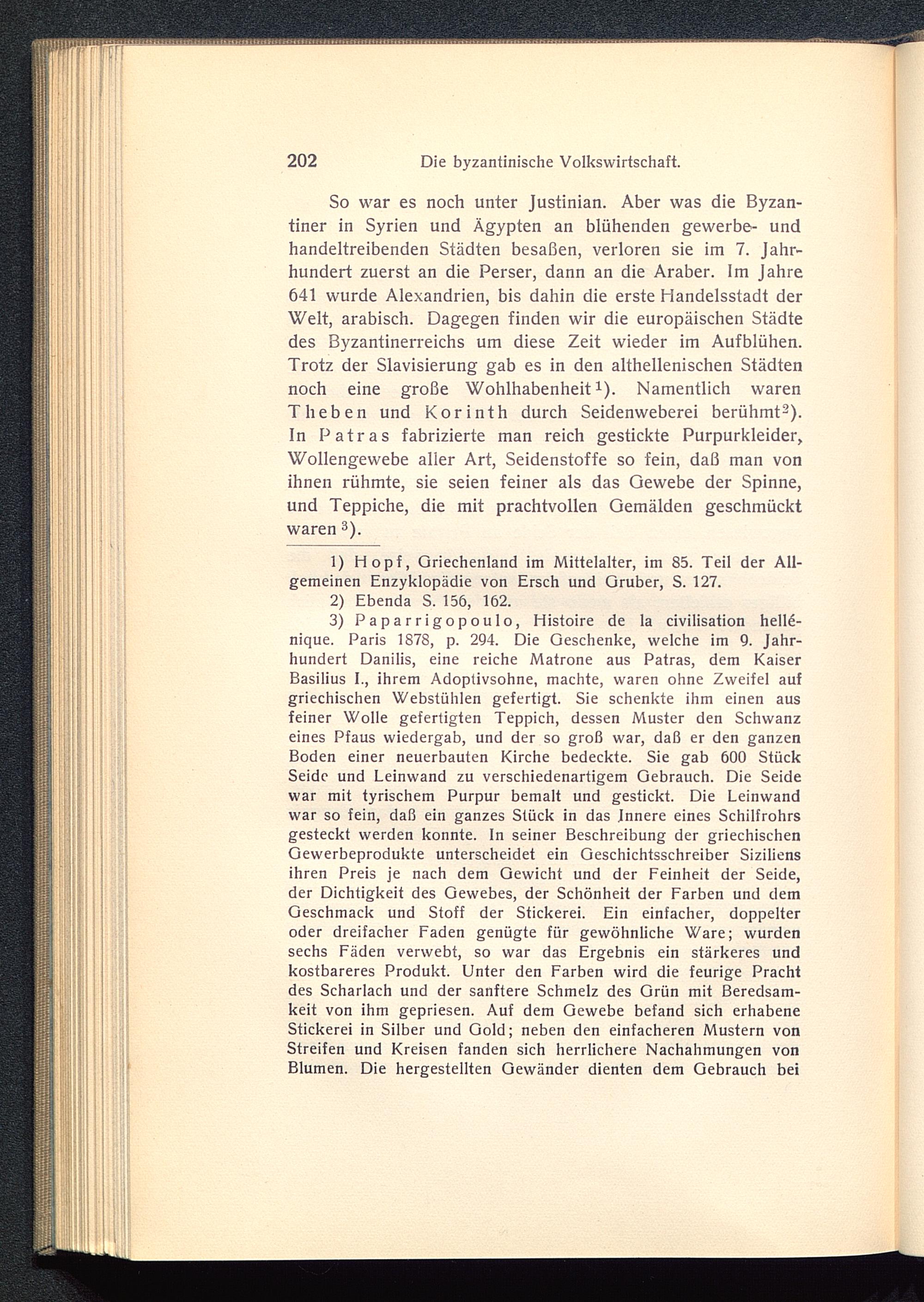 So war es noch unter Justinian . Aber was die Byzan-tiner in Syrien und Ägypten an blühenden gewerbe- undhandeltreibenden Städten besaßen, verloren sie im 7. Jahr-hundert zuerst an die Perser, dann an die Araber. Im Jahre641 wurde Alexandrien , bis dahin die erste Handelsstadt derWelt, arabisch. Dagegen finden wir die europäischen Städtedes Byzantinerreichs um diese Zeit wieder im Aufblühen.Trotz der Slavisierung gab es in den althellenischen Städtennoch eine große Wohlhabenheit 1 ). Namentlich warenTheben und Korinth durch Seidenweberei berühmt 2 ).In Patras fabrizierte man reich gestickte Purpurkleider,Wollengewebe aller Art, Seidenstoffe so fein, daß man vonihnen rühmte, sie seien feiner als das Gewebe der Spinne,und Teppiche, die mit prachtvollen Gemälden geschmücktwaren 3 ).
