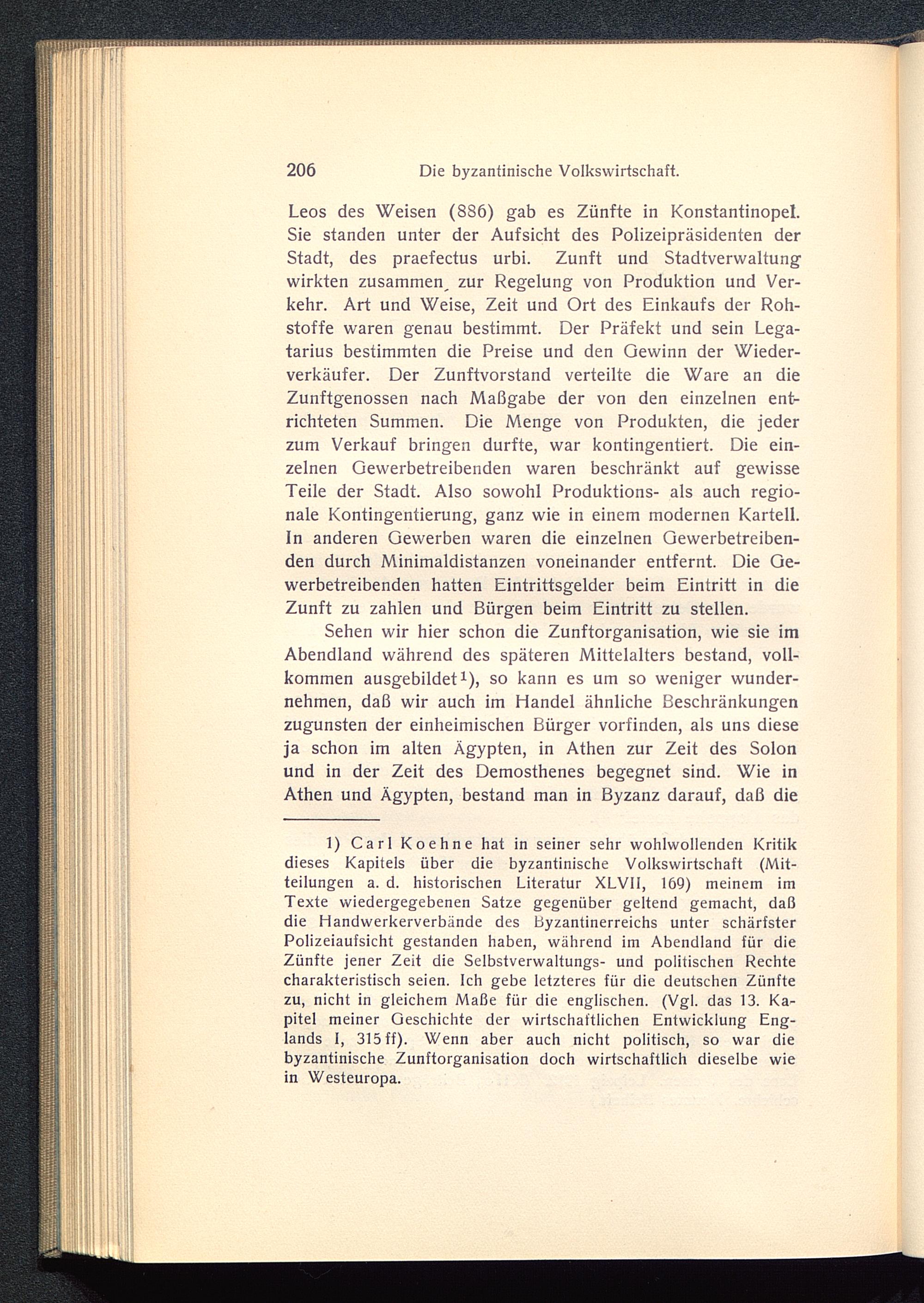 1) Carl Koehne hat in seiner sehr wohlwollenden Kritikdieses Kapitels über die byzantinische Volkswirtschaft (Mit-teilungen a. d. historischen Literatur XLVII, 169) meinem imTexte wiedergegebenen Satze gegenüber geltend gemacht, daßdie Handwerkerverbände des Byzantinerreichs unter schärfsterPolizeiaufsicht gestanden haben, während im Abendland für dieZünfte jener Zeit die Selbstverwaltungs- und politischen Rechtecharakteristisch seien. Ich gebe letzteres für die deutschen Zünftezu, nicht in gleichem Maße für die englischen. (Vgl. das 13. Ka-pitel meiner Geschichte der wirtschaftlichen Entwicklung Eng-lands I, 315 ff). Wenn aber auch nicht politisch, so war diebyzantinische Zunftorganisation doch wirtschaftlich dieselbe wiein Westeuropa.