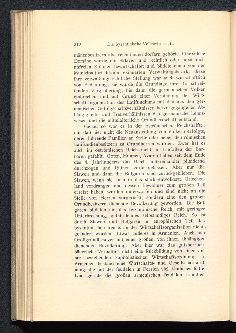 Genau so war es in der oströmischen Reichshälfte;nur daß hier nicht die Neuansiedlung von Völkern erfolgte,deren führende Familien an Stelle oder neben den römischenLatifundienbesitzern zu Grundherren wurden. Zwar hat esauch im oströmischen Reich nicht an Einfällen der Bar-baren gefehlt. Goten, Hunnen, Avaren haben seit dem Endedes 4. Jahrhunderts das Reich hintereinander plündernddurchzogen und Ruinen zurückgelassen. Aber nur dieSlawen und dann die Bulgaren sind zurückgeblieben. DieSlawen, wenn sie auch in das stark entvölkerte Griechen-land vordrangen und dessen Bewohner zum großen Teilersetzt haben, wurden unterworfen und sind nicht an dieStelle von Herren vorgerückt, sondern eine den großenGrundbesitzern dienende Bevölkerung geworden. Die Bul-garen bildeten ein das byzantinische Reich, mit geringerUnterbrechung, gefährdendes selbständiges Reich. So istdurch Slawen und Bulgaren im europäischen Teil desbyzantinischen Reichs an der Wirtschaftsorganisation nichtsgeändert worden. Etwas anderes in Armenien . Auch hierGroßgrundbesitzer mit einer großen, von ihnen abhängigendienenden Bevölkerung. Aber hier war das gutsherrlich-bäuerliche Verhältnis nicht eine Rückbildung von einer vor-her bestehenden kapitalistischen Wirtschaftsordnung. InArmenien bestand eine Wirtschafts- und Gesellschaftsord-nung, die mit der feudalen in Persien viel Ähnliches hatte.Und gerade die großen armenischen feudalen Familien