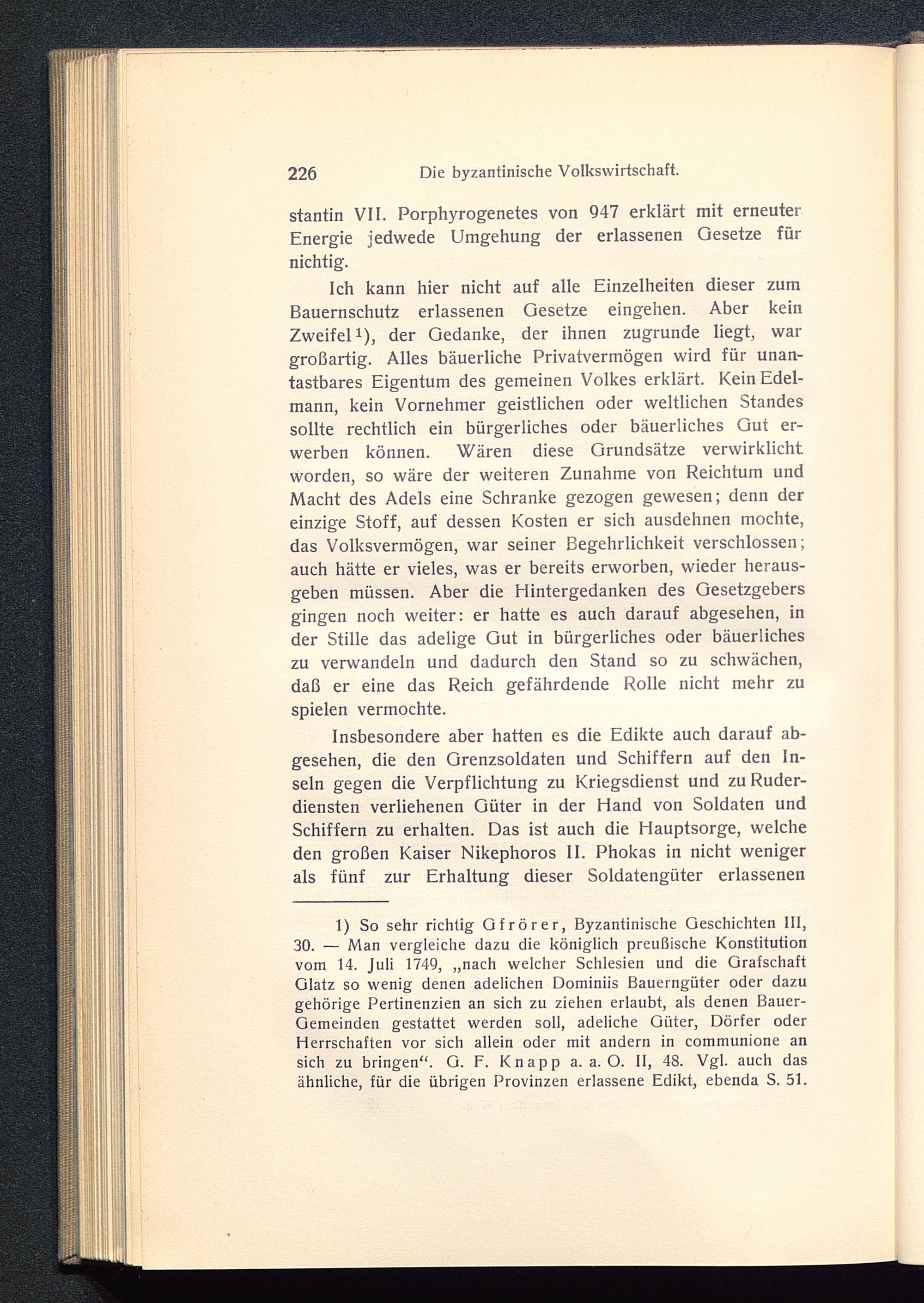 1) So sehr richtig Gfrörer, Byzantinische Geschichten III,30. — Man vergleiche dazu die königlich preußische Konstitutionvom 14. Juli 1749, „nach welcher Schlesien und die GrafschaftGlatz so wenig denen adelichen Dominiis Bauerngüter oder dazugehörige Pertinenzien an sich zu ziehen erlaubt, als denen Bauer-Gemeinden gestattet werden soll, adeliche Güter, Dörfer oderHerrschaften vor sich allein oder mit andern in communione ansich zu bringen“. G. F. Knapp a. a. O. II, 48. Vgl. auch dasähnliche, für die übrigen Provinzen erlassene Edikt, ebenda S. 51.