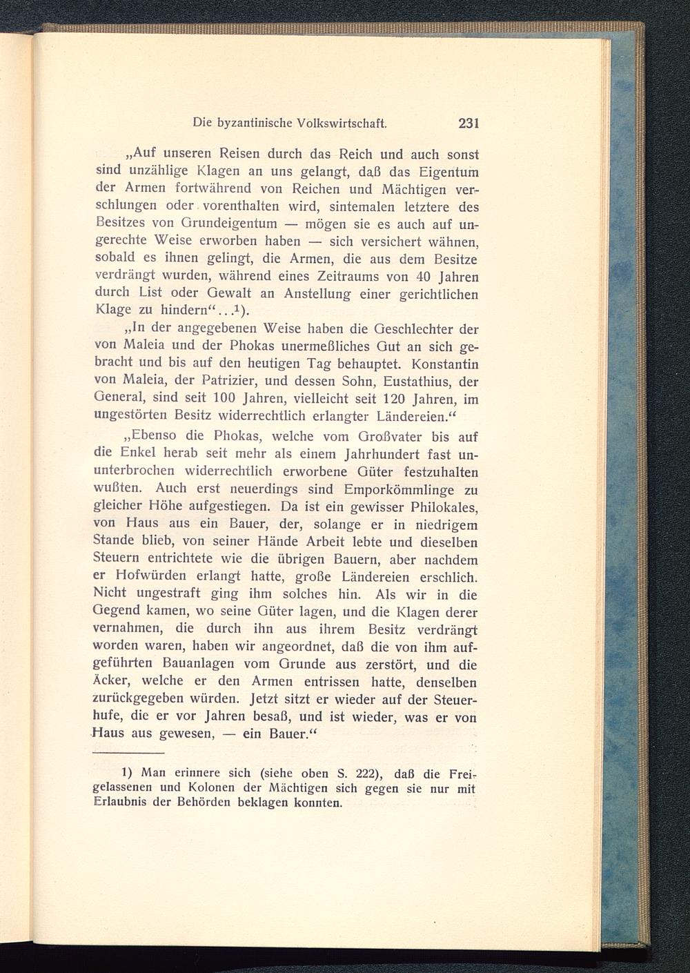 „Ebenso die Phokas , welche vom Großvater bis aufdie Enkel herab seit mehr als einem Jahrhundert fast un-unterbrochen widerrechtlich erworbene Güter festzuhaltenwußten. Auch erst neuerdings sind Emporkömmlinge zugleicher Höhe aufgestiegen. Da ist ein gewisser Philokales,von Haus aus ein Bauer, der, solange er in niedrigemStande blieb, von seiner Hände Arbeit lebte und dieselbenSteuern entrichtete wie die übrigen Bauern, aber nachdemer Hofwürden erlangt hatte, große Ländereien erschlich.Nicht ungestraft ging ihm solches hin. Als wir in dieGegend kamen, wo seine Güter lagen, und die Klagen derervernahmen, die durch ihn aus ihrem Besitz verdrängtworden waren, haben wir angeordnet, daß die von ihm auf-geführten Bauanlagen vom Grunde aus zerstört, und dieÄcker, welche er den Armen entrissen hatte, denselbenzurückgegeben würden. Jetzt sitzt er wieder auf der Steuer-hufe, die er vor Jahren besaß, und ist wieder, was er vonHaus aus gewesen, — ein Bauer.“
