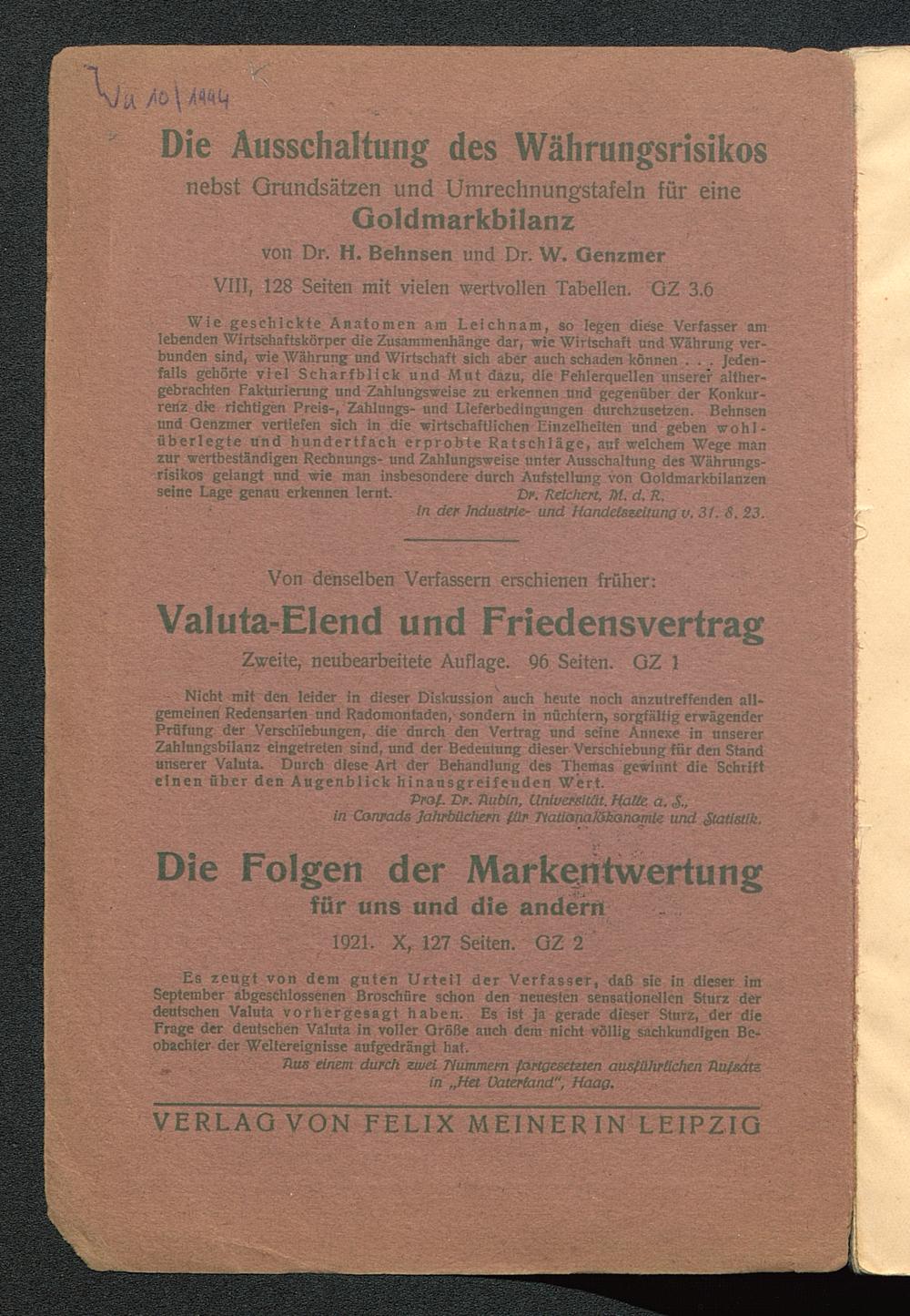 Es zeugt.von dem guten Urteil der Verfasser, daß sie in dieser imSeptember abgeschlossenen Broschüre schon den neuesten sensationellen Sturz derdeutschen Valuta vorhergesagt haben.. Es ist Ja gerade dieser Sturz, der dieFrage der deutschen Valuta ln voller Größe auch dem nicht völlig sachkundigen Be-obachter der Weltereignisse aufgedrängt hat.