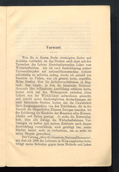 Der Vortrag „über die klassische Nationalökonomie“,mit dem ich 1888 das Lehramt in WUen angetreten habe,bringt meine Bedenken gegen deren Methode und Lehre