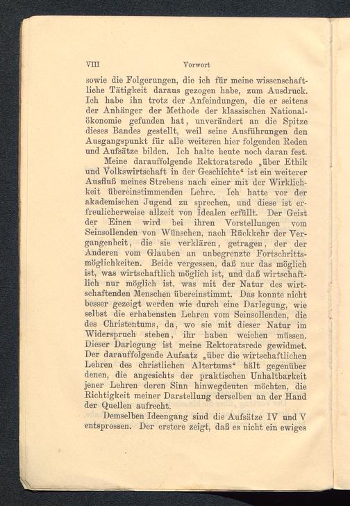 Meine darauffolgende Rektoratsrede „über Ethikund Volkswirtschaft in der Geschichte“ ist ein weitererAusfluß meines Strehens nach einer mit der Wirklich-keit übereinstimmenden Lehre. Ich hatte vor derakademischen Jugend zu sprechen, und diese ist er-freulicherweise allzeit von Idealen erfüllt. Der Geistder Einen wird bei ihren Vorstellungen vomSeinsollenden von Wünschen, nach Rückkehr der Ver-gangenheit , die sie verklären, getragen, der derAnderen vom Glauben an unbegrenzte Fortschritts-möglichkeiten. Beide vergessen, daß nur das möglichist, was wirtschaftlich möglich ist, und daß wirtschaft-lich nur möglich ist, was mit der Natur des wirt-schaftenden Menschen übereinstimmt. Das konnte nichtbesser gezeigt werden wie durch eine Darlegung, wieselbst die erhabensten Lehren vom Seinsollenden, diedes Christentums, da, wo sie mit dieser Natur imWiderspruch stehen, ihr haben weichen müssen.Dieser Darlegung ist meine Rektoratsrede gewidmet.Der darauffolgende Aufsatz „über die wirtschaftlichenLehren des christlichen Altertums“ hält gegenüberdenen, die angesichts der praktischen Unhaltbarkeitjener Lehren deren Sinn hinwegdeuten möchten, dieRichtigkeit meiner Darstellung derselben an der Handder Quellen aufrecht.