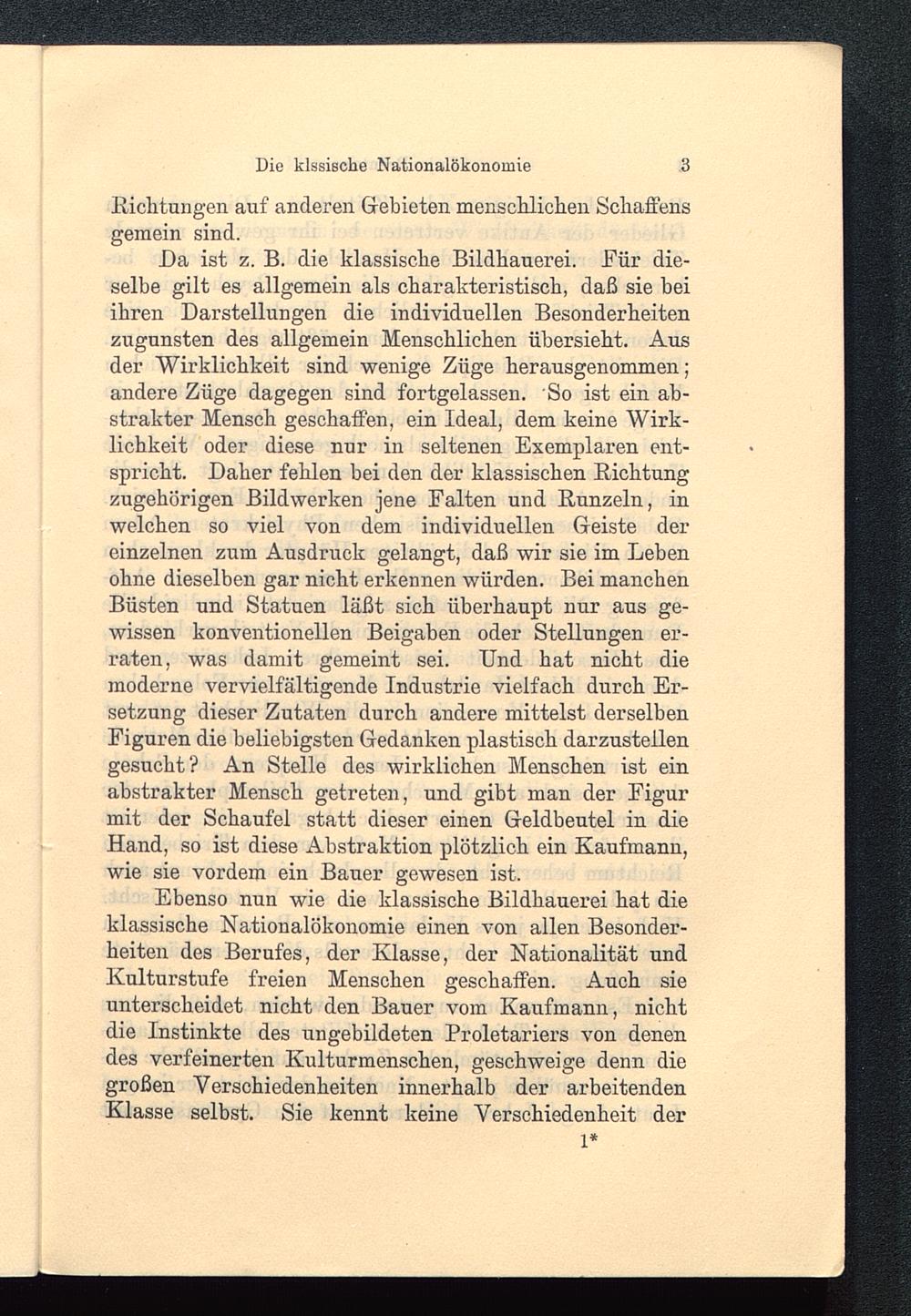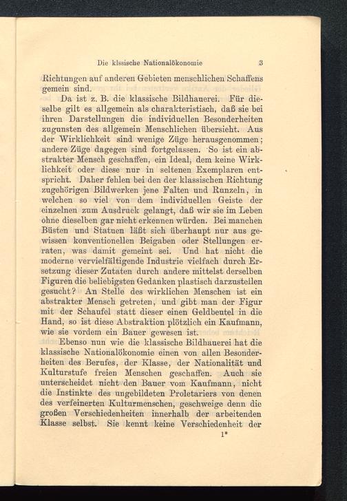 Ebenso nun wie die klassische Bildhauerei hat dieklassische Nationalökonomie einen von allen Besonder-heiten des Berufes, der Klasse, der Nationalität undKulturstufe freien Menschen geschaffen. Auch sieunterscheidet nicht den Bauer vom Kaufmann, nichtdie Instinkte des ungebildeten Proletariers von denendes verfeinerten Kulturmenschen, geschweige denn diegroßen Verschiedenheiten innerhalb der arbeitendenKlasse selbst. Sie kennt keine Verschiedenheit der