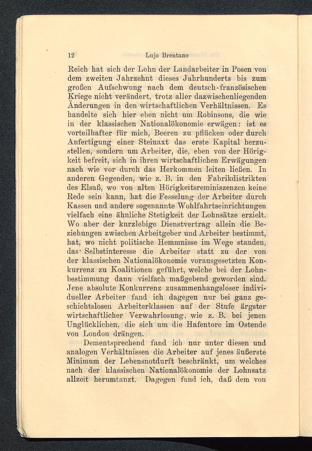 Reich hat sich der Lohn der Landarbeiter in Posen vondem zweiten Jahrzehnt dieses Jahrhunderts bis zumgroßen Aufschwung nach dem deutsch -französischenKriege nicht verändert, trotz aller dazwischenliegendenÄnderungen in den wirtschaftlichen Verhältnissen. Eshandelte sich hier eben nicht um Robinsons, die wiein der klassischen Nationalökonomie erwägen: ist esvorteilhafter für mich, Beeren zu pflücken oder durchAnfertigung einer Steinaxt das erste Kapital herzu-stellen, sondern um Arbeiter, die, eben von der Hörig-keit befreit, sich in ihren wirtschaftlichen Erwägungennach wie vor durch das Herkommen leiten ließen. Inanderen Gegenden, wie z. B. in den Fabrikdistriktendes Elsaß, wo von alten Hörigkeitsreminiszenzen keineRede sein kann, hat die Fesselung der Arbeiter durchKassen und andere sogenannte Wohlfahrtseinrichtungenvielfach eine ähnliche Stetigkeit der Lohnsätze erzielt.Wo aber der kurzlebige Dienstvertrag allein die Be-ziehungen zwischen Arbeitgeber und Arbeiter bestimmt,hat, wo nicht politische Hemmnisse im Wege standen,das’ Selbstinteresse die Arbeiter statt zu der vonder klassischen Nationalökonomie vorausgesetzten Kon-kurrenz zu Koalitionen geführt, welche bei der Lohn-bestimmung dann vielfach maßgebend geworden sind.Jene absolute Konkurrenz zusammenhangsloser indivi-dueller Arbeiter fand ich dagegen nur bei ganz ge-schichtslosen Arbeiterklassen auf der Stufe ärgsterwirtschaftlicher Verwahrlosung, wie z. B. hei jenenUnglücklichen, die sich um die Hafentore im Ostende von London drängen.