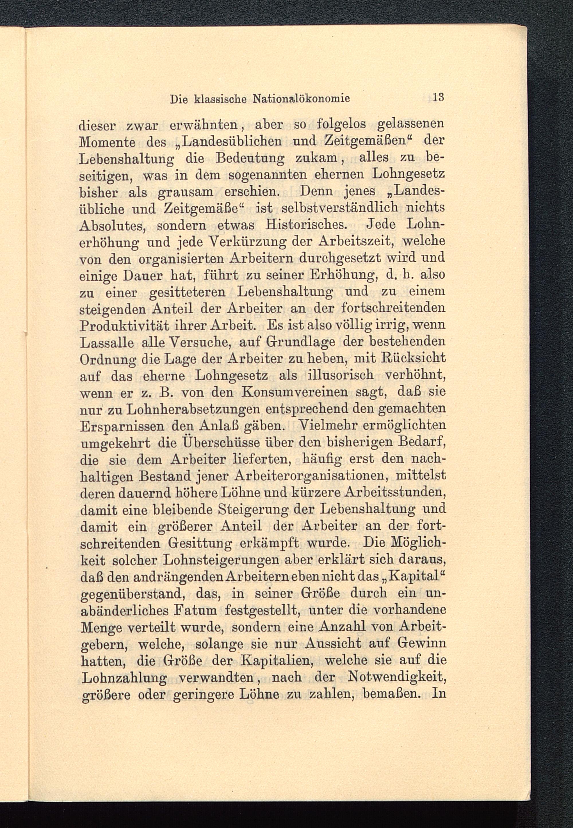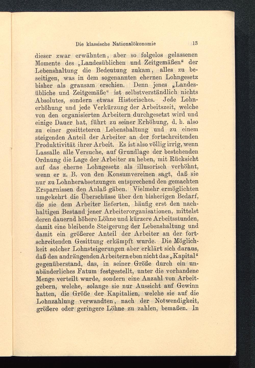 dieser zwar erwähnten, aber so folgelos gelassenenMomente des „Landesüblichen und Zeitgemäßen“ derLebenshaltung die Bedeutung zukam, alles zu be-seitigen, was in dem sogenannten ehernen Lobngesetzbisher als grausam erschien. Denn jenes „Landes-übliche und Zeitgemäße“ ist selbstverständlich nichtsAbsolutes, sondern etwas Historisches. Jede Lohn-erhöhung und jede Verkürzung der Arbeitszeit, welchevon den organisierten Arbeitern durchgesetzt wird undeinige Dauer hat, führt zu seiner Erhöhung, d. h. alsozu einer gesitteteren Lebenshaltung und zu einemsteigenden Anteil der Arbeiter an der fortschreitendenProduktivität ihrer Arbeit. Es ist also völlig irrig, wennLassalle alle Versuche, auf Grundlage der bestehendenOrdnung die Lage der Arbeiter zu heben, mit Rücksichtauf das eherne Lohngesetz als illusorisch verhöhnt,wenn er z. B. von den Konsumvereinen sagt, daß sienur zu Lohnherabsetzungen entsprechend den gemachtenErsparnissen den Anlaß gäben. Vielmehr ermöglichtenumgekehrt die Überschüsse über den bisherigen Bedarf,die sie dem Arbeiter lieferten, häufig erst den nach-haltigen Bestand jener Arbeiterorganisationen, mittelstderen dauernd höhere Löhne und kürzere Arbeitsstunden,damit eine bleibende Steigerung der Lebenshaltung unddamit ein größerer Anteil der Arbeiter an der fort-schreitenden Gesittung erkämpft wurde. Die Möglich-keit solcher Lohnsteigerungen aber erklärt sich daraus,daß den andrängendenArbeiternebennichtdas„Kapital“gegenüberstand, das, in seiner Größe durch ein un-abänderliches Fatum festgestellt, unter die vorhandeneMenge verteilt wurde, sondern eine Anzahl von Arbeit-gebern, welche, solange sie nur Aussicht auf Gewinnhatten, die Größe der Kapitalien, welche sie auf dieLohnzahlung verwandten, nach der Notwendigkeit,größere oder geringere Löhne zu zahlen, bemaßen. ln