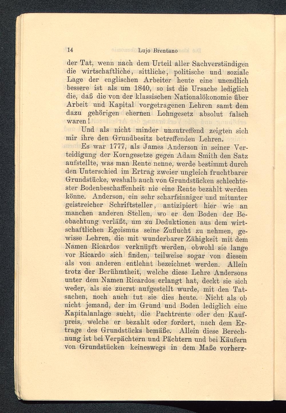 Es war 1777, als James Anderson in seiner Ver-teidigung der Korngesetze gegen Adam Smith den Satzaufstellte, was man Rente nenne, werde bestimmt durchden Unterschied im Ertrag zweier ungleich fruchtbarerGrundstücke, weshalb auch von Grundstücken schlechte-ster Bodenbeschaffenheit nie eine Rente bezahlt werdenkönne. Anderson, ein sehr scharfsinniger und mituntergeistreicher Schriftsteller, antizipiert hier wie anmanchen anderen Stellen, wo er den Boden der Be-obachtung verläßt, um zu Deduktionen aus dem wirt-schaftlichen Egoismus seine Zuflucht zu nehmen, ge-wisse Lehren, die mit wunderbarer Zähigkeit mit demNamen Ricardos verknüpft werden, obwohl sie langevor Ricardo sich finden, teilweise sogar von diesemals von anderen entlehnt bezeichnet werden. Alleintrotz der Berühmtheit, welche diese Lehre Andersonsunter dem Namen Ricardos erlangt hat, deckt sie sichweder, als sie zuerst aufgestellt wurde, mit den Tat-sachen, noch auch tut sie dies heute. Nicht als obnicht jemand, der im Grund und Boden lediglich eineKapitalanlage sucht, die Pachtrente oder den Kauf-preis, welche er bezahlt oder fordert, nach dem Er-trage des Grundstücks bemäße. Allein diese Berech-nung ist bei Verpächtern und Pächtern und bei Käufernvon Grundstücken keineswegs in dem Maße vorherr-