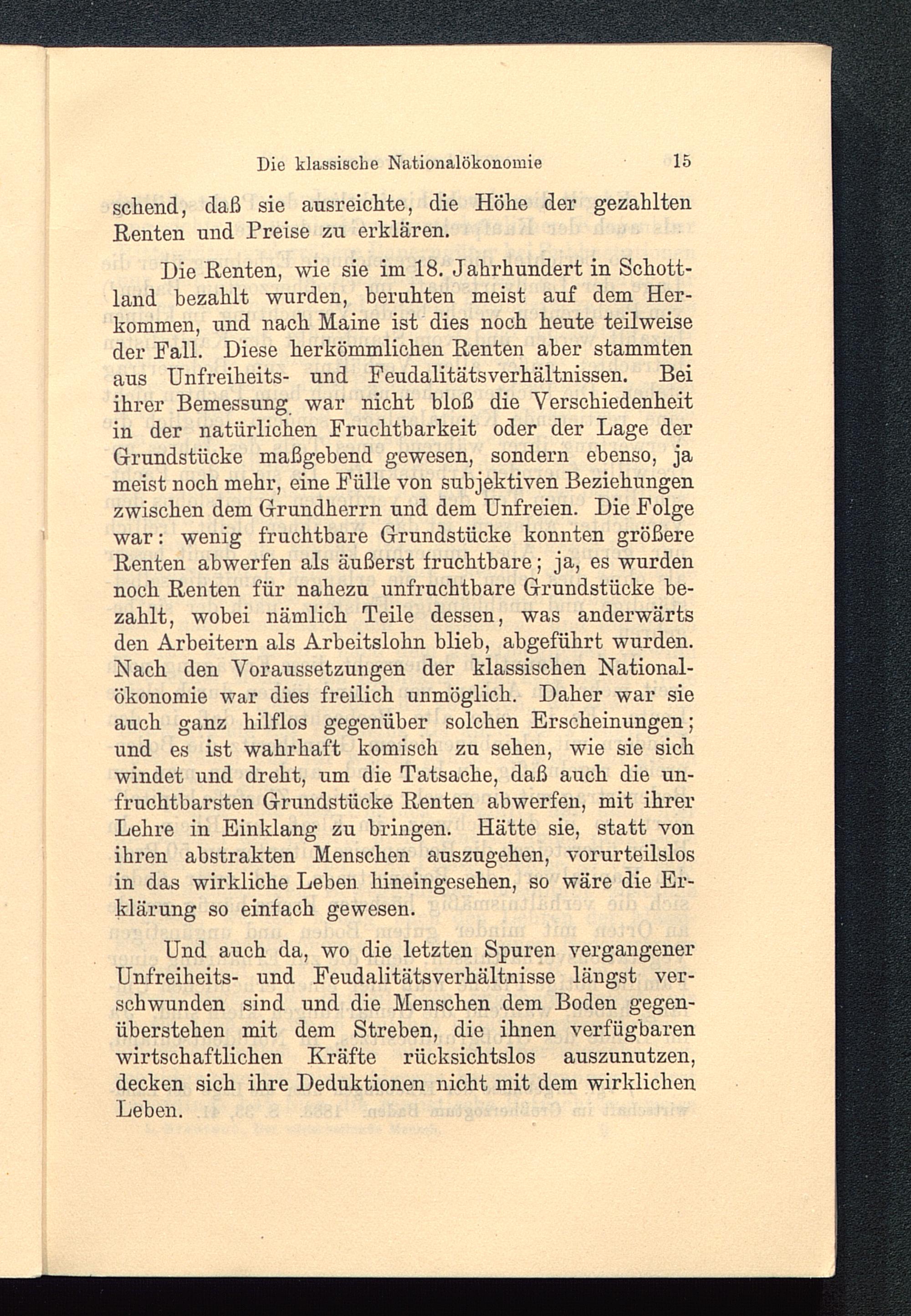 Und auch da, wo die letzten Spuren vergangenerUnfreiheits- und Feudalitätsverhältnisse längst ver-schwunden sind und die Menschen dem Boden gegen-überstehen mit dem Streben, die ihnen verfügbarenwirtschaftlichen Kräfte rücksichtslos auszunutzen,decken sich ihre Deduktionen nicht mit dem wirklichenLeben.