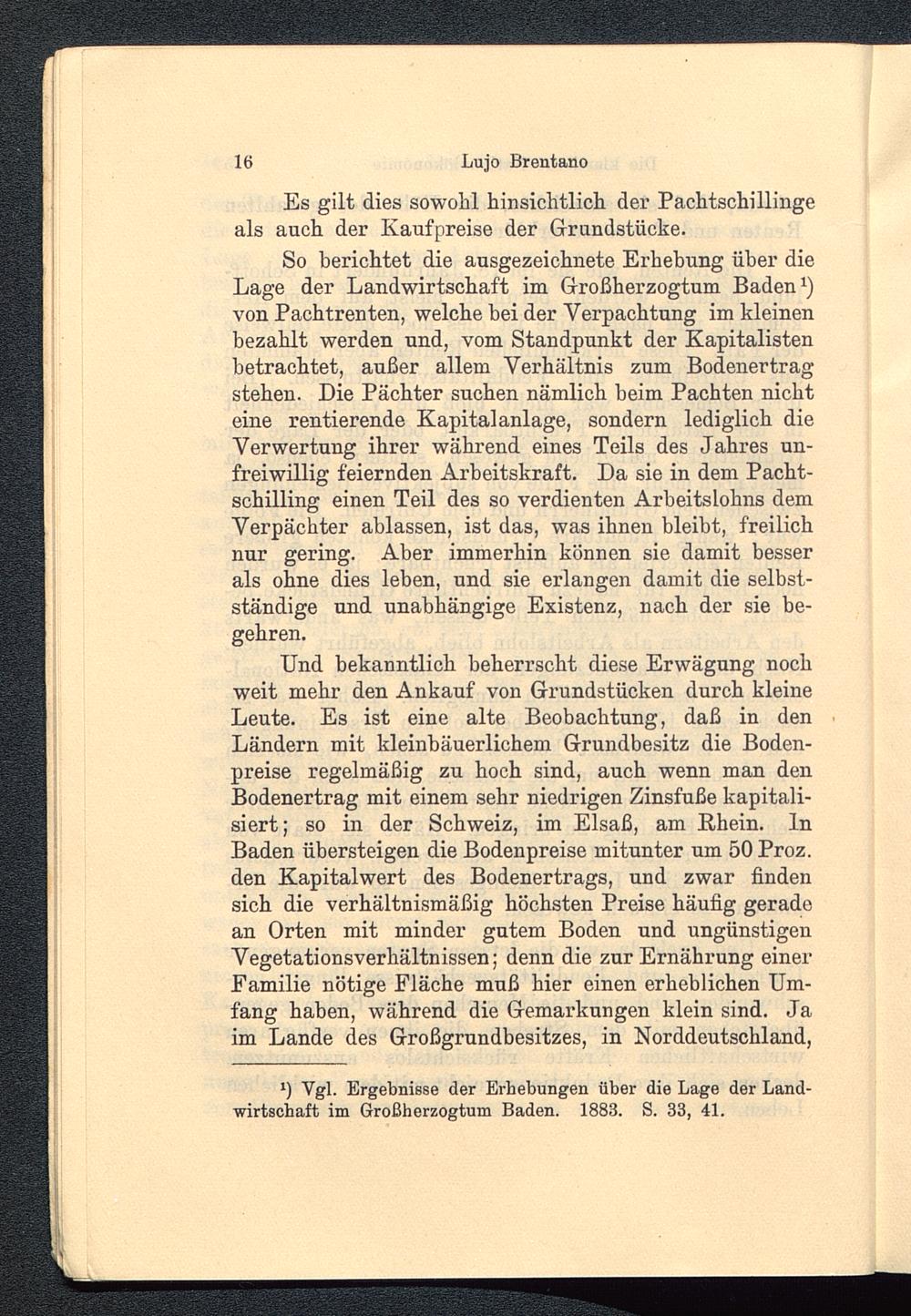 So berichtet die ausgezeichnete Erhebung über dieLage der Landwirtschaft im Großherzogtum Baden 1 )von Pachtrenten, welche bei der Verpachtung im kleinenbezahlt werden und, vom Standpunkt der Kapitalistenbetrachtet, außer allem Verhältnis zum Bodenertragstehen. Die Pächter suchen nämlich heim Pachten nichteine rentierende Kapitalanlage, sondern lediglich dieVerwertung ihrer während eines Teils des Jahres un-freiwillig feiernden Arbeitskraft. Da sie in dem Pacht-schilling einen Teil des so verdienten Arbeitslohns demVerpächter ablassen, ist das, was ihnen bleibt, freilichnur gering. Aber immerhin können sie damit besserals ohne dies leben, und sie erlangen damit die selbst-ständige und unabhängige Existenz, nach der sie be-gehren.