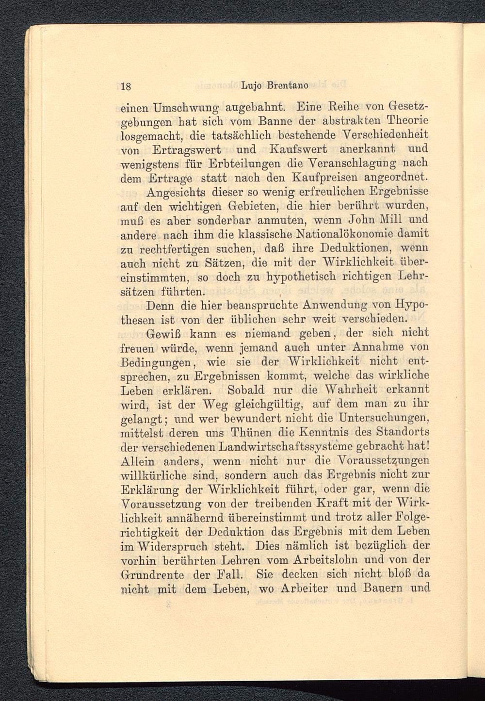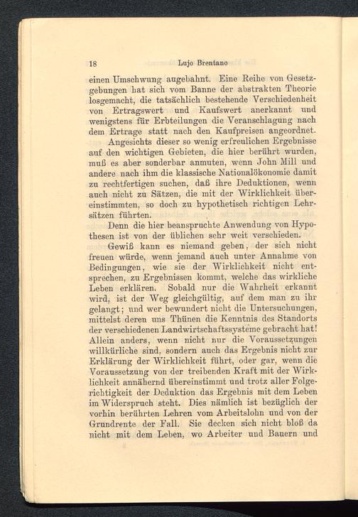 Gewiß kann es niemand geben, der sich nichtfreuen würde, wenn jemand auch unter Annahme vonBedingungen, wie sie der Wirklichkeit nicht ent-sprechen, zu Ergebnissen kommt, welche das wirklicheLeben erklären. Sobald nur die Wahrheit erkanntwird, ist der Weg gleichgültig, auf dem man zu ihrgelangt; und wer bewundert nicht die Untersuchungen,mittelst deren uns Thünen die Kenntnis des Standortsder verschiedenen Landwirtschaftssysteme gebracht hat!Allein anders, wenn nicht nur die Voraussetzungenwillkürliche sind, sondern auch das Ergebnis nicht zurErklärung der Wirklichkeit führt, oder gar, wenn dieVoraussetzung von der treibenden Kraft mit der Wirk-lichkeit annähernd übereinstimmt und trotz aller Folge-richtigkeit der Deduktion das Ergebnis mit dem Lebenim Widerspruch steht. Dies nämlich ist bezüglich dervorhin berührten Lehren vom Arbeitslohn und von derGrundrente der Fall. Sie decken sich nicht bloß danicht mit dem Leben, wo Arbeiter und Bauern und