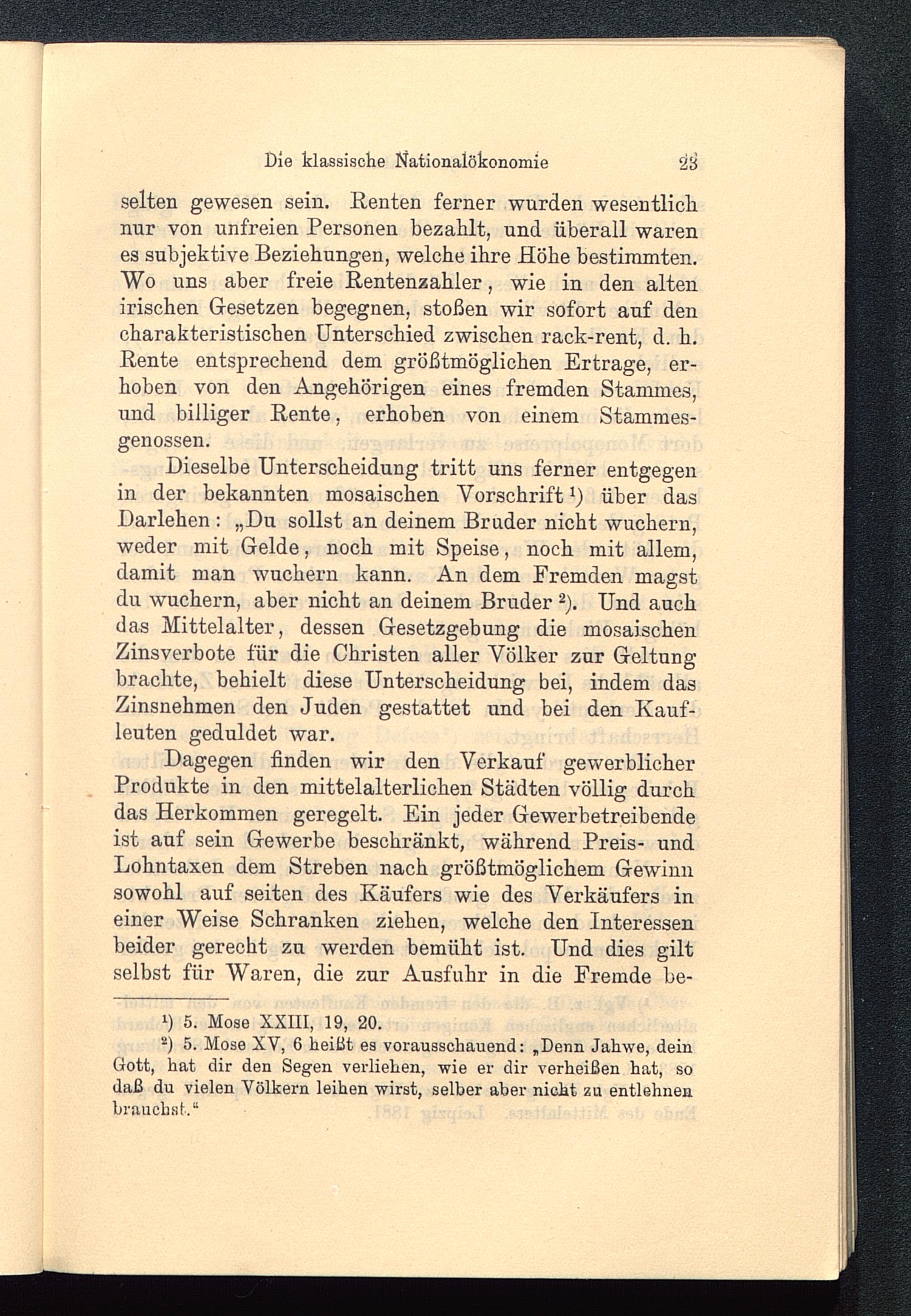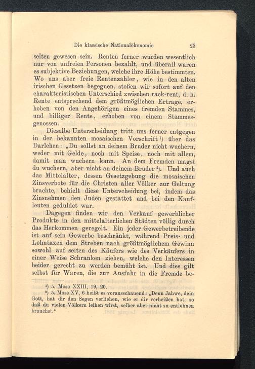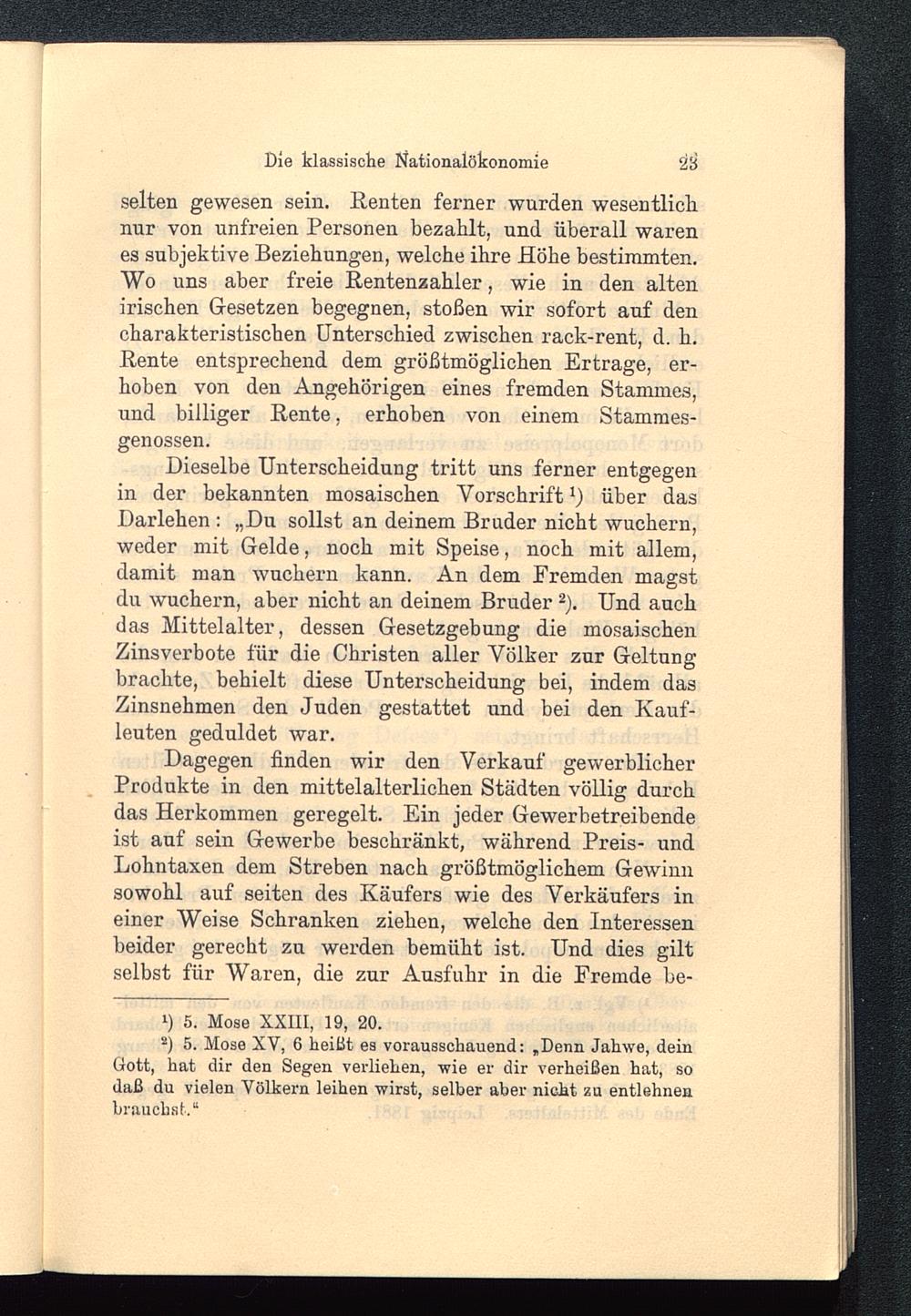 Dieselbe Unterscheidung tritt uns ferner entgegenin der bekannten mosaischen Vorschrift 1 ) über dasDarlehen : „Du sollst an deinem Bruder nicht wuchern,weder mit Gelde, noch mit Speise, noch mit allem,damit man wuchern kann. An dem Fremden magstdu wuchern, aber nicht an deinem Bruder 2 ). Und auchdas Mittelalter, dessen Gesetzgebung die mosaischenZinsverbote für die Christen aller Völker zur Geltungbrachte, behielt diese Unterscheidung bei, indem dasZinsnehmen den Juden gestattet und bei den Kauf-leuten geduldet war.
