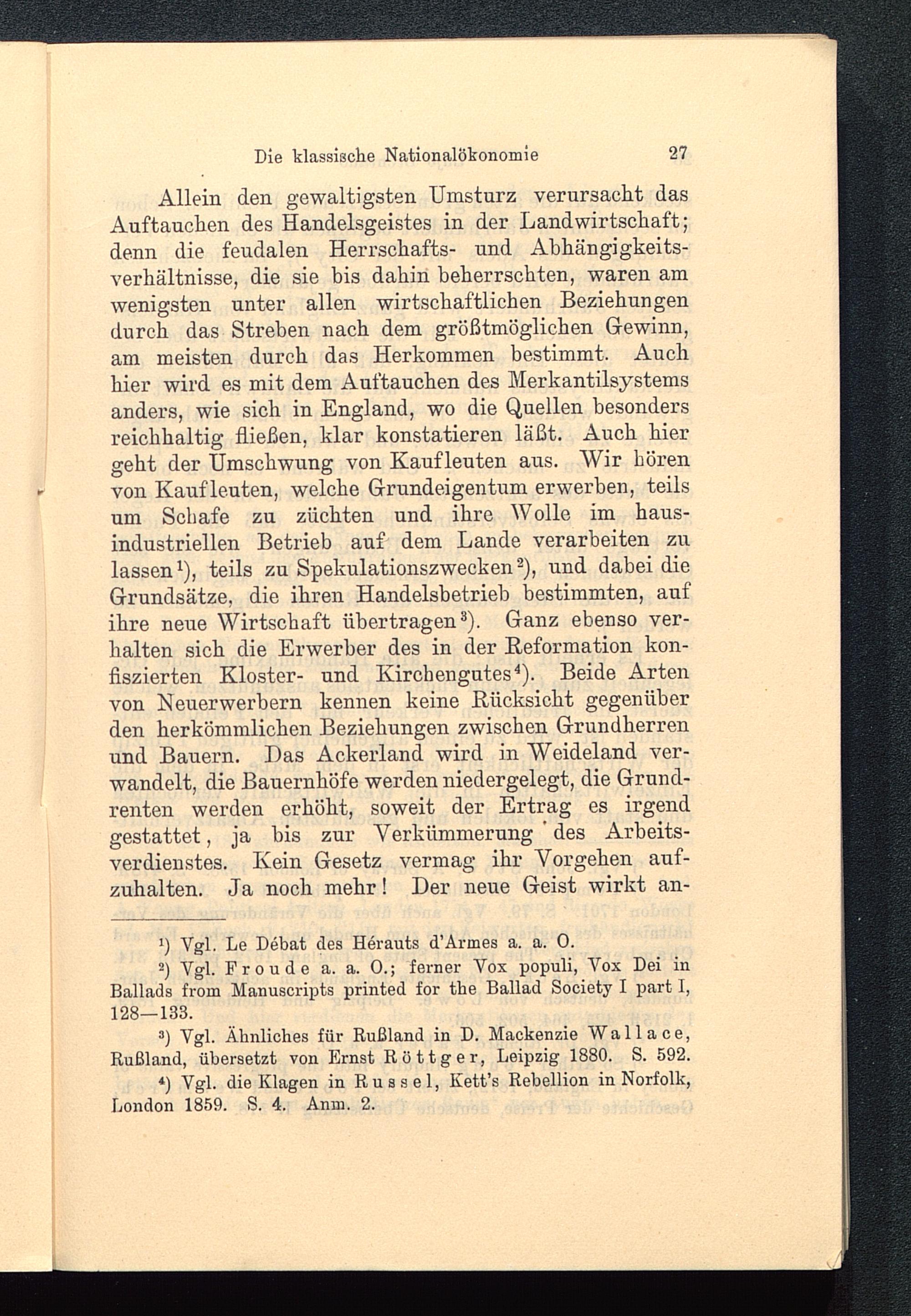 Allein den gewaltigsten Umsturz verursacht dasAuftauchen des Handelsgeistes in der Landwirtschaft;denn die feudalen Herrschafts- und Abhängigkeits-Verhältnisse, die sie bis dahin beherrschten, waren amwenigsten unter allen wirtschaftlichen Beziehungendurch das Streben nach dem größtmöglichen Gewinn,am meisten durch das Herkommen bestimmt. Auchhier wird es mit dem Auftauchen des Merkantilsystemsanders, wie sich in England , wo die Quellen besondersreichhaltig fließen, klar konstatieren läßt. Auch hiergeht der Umschwung von Kaufleuten aus. Wir hörenvon Kauf leuten, welche Grundeigentum erwerben, teilsum Schafe zu züchten und ihre Wolle im haus-industriellen Betrieb auf dem Lande verarbeiten zulassen 1 ), teils zu Spekulationszwecken 2 ), und dabei dieGrundsätze, die ihren Handelsbetrieb bestimmten, aufihre neue Wirtschaft übertragen 3 ). Ganz ebenso ver-halten sich die Erwerber des in der Reformation kon-fiszierten Kloster- und Kirchengutes 4 ). Beide Artenvon Neuerwerbern kennen keine Rücksicht gegenüberden herkömmlichen Beziehungen zwischen Grundherrenund Bauern. Das Ackerland wird in Weideland ver-wandelt, die Bauernhöfe werden niedergelegt, die Grund-renten werden erhöht, soweit der Ertrag es irgendgestattet, ja bis zur Verkümmerung ’ des Arbeits-verdienstes. Kein Gesetz vermag ihr Vorgehen auf-zuhalten. Ja noch mehr! Der neue Geist wirkt an-