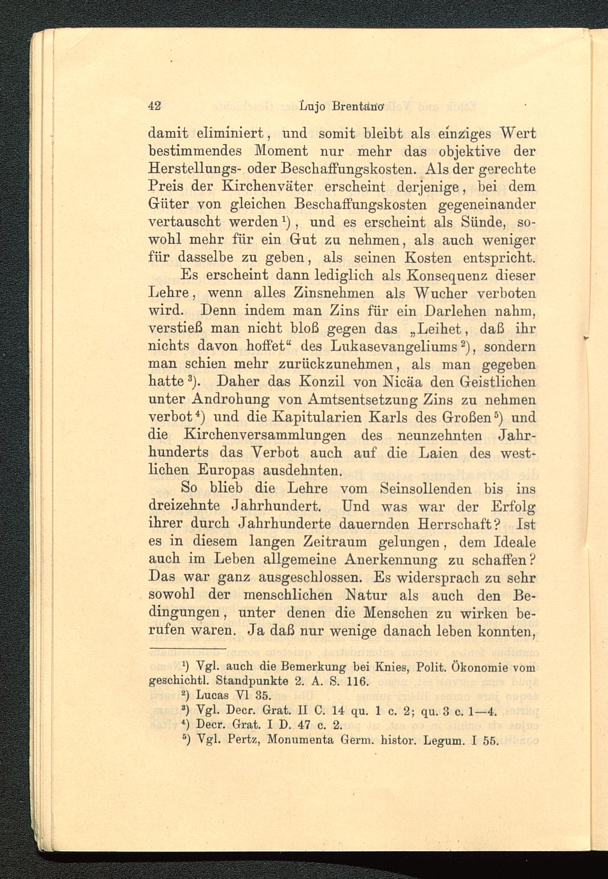 Es erscheint dann lediglich als Konsequenz dieserLehre, wenn alles Zinsnehmen als Wucher verbotenwird. Denn indem man Zins für ein Darlehen nahm,verstieß man nicht bloß gegen das „Leihet, daß ihrnichts davon hoffet“ des Lukasevangeliums * 2 ), sondernman schien mehr zurückzunehmen, als man gegebenhatte 3 ). Daher das Konzil von Nicäa den Geistlichenunter Androhung von Amtsentsetzung Zins zu nehmenverbot 4 ) und die Kapitularien Karls des Großen 5 ) unddie Kirchenversammlungen des neunzehnten Jahr-hunderts das Verbot auch auf die Laien des west-lichen Europas ausdehnten.
