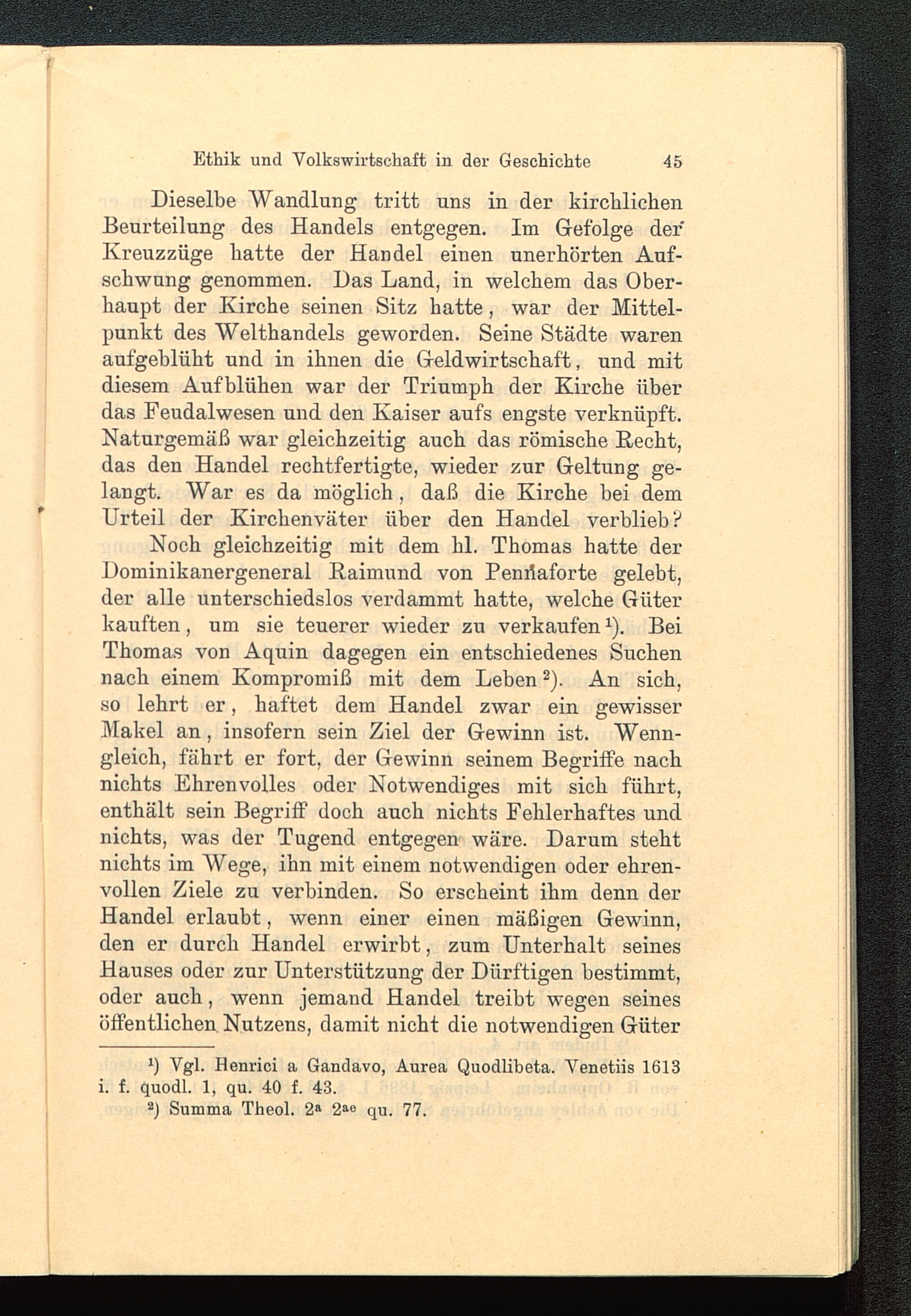 Noch gleichzeitig mit dem hl. Thomas hatte derDominikanergeneral Haimund von Penriaforte gelebt,der alle unterschiedslos verdammt hatte, welche Güterkauften, um sie teuerer wieder zu verkaufen * 1 ). BeiThomas von Aquin dagegen ein entschiedenes Suchennach einem Kompromiß mit dem Leben 2 ). An sich,so lehrt er, haftet dem Handel zwar ein gewisserMakel an, insofern sein Ziel der Gewinn ist. Wenn-gleich, fährt er fort, der Gewinn seinem Begriffe nachnichts Ehrenvolles oder Notwendiges mit sich führt,enthält sein Begriff doch auch nichts Fehlerhaftes undnichts, was der Tugend entgegen wäre. Darum stehtnichts im Wege, ihn mit einem notwendigen oder ehren-vollen Ziele zu verbinden. So erscheint ihm denn derHandel erlaubt, wenn einer einen mäßigen Gewinn,den er durch Handel erwirbt, zum Unterhalt seinesHauses oder zur Unterstützung der Dürftigen bestimmt,oder auch, wenn jemand Handel treibt wegen seinesöffentlichen Nutzens, damit nicht die notwendigen Güter