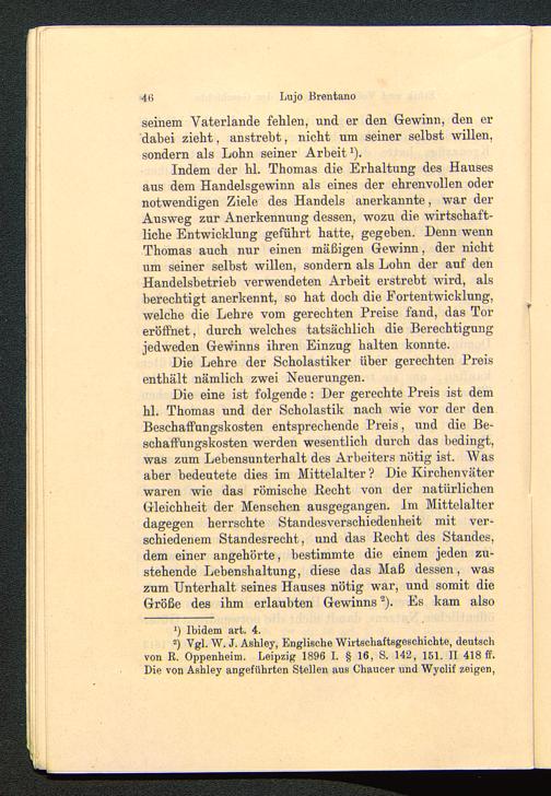 Indem der hl. Thomas die Erhaltung des Hausesaus dem Handelsgewinn als eines der ehrenvollen odernotwendigen Ziele des Handels anerkannte, war derAusweg zur Anerkennung dessen, wozu die wirtschaft-liche Entwicklung geführt hatte, gegeben. Denn wennThomas auch nur einen mäßigen Gewinn, der nichtum seiner selbst willen, sondern als Lohn der auf denHandelsbetrieb verwendeten Arbeit erstrebt wird, alsberechtigt anerkennt, so hat doch die Fortentwicklung,welche die Lehre vom gerechten Preise fand, das Toreröffnet, durch welches tatsächlich die Berechtigungjedweden Gewinns ihren Einzug halten konnte.