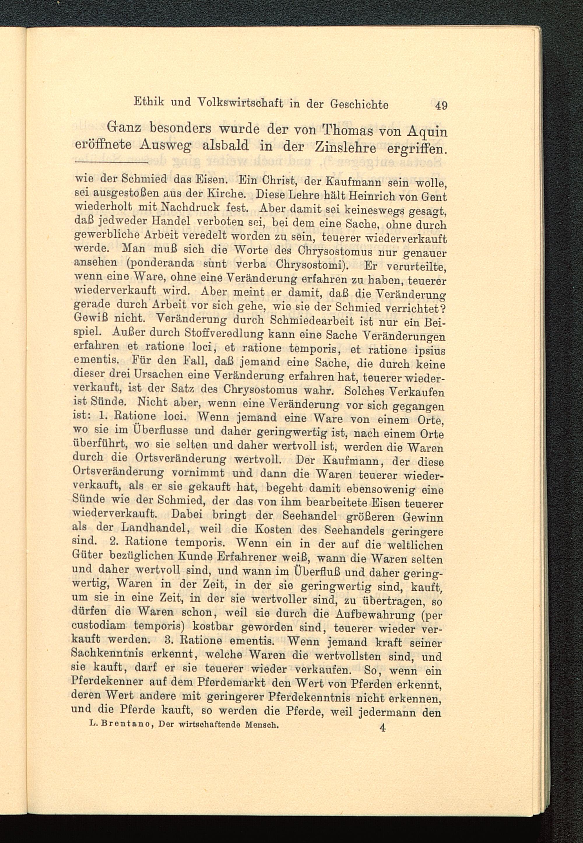 wie der Schmied das Eisen. Ein Christ, der Kaufmann sein wolle,sei ausgestoßen aus der Kirche. Diese Lehre hält Heinrich von Gent wiederholt mit Nachdruck fest. Aber damit sei keineswegs gesagt,daß jedweder Handel verboten sei, bei dem eine Sache, ohne durchgewerbliche Arbeit veredelt worden zu sein, teuerer wiederverkauftwerde. Man muß sich die Worte des Chrysostomus nur genaueransehen (ponderanda sunt verba Chrysostomi). Er verurteilte,wenn eine Ware, ohne eine Veränderung erfahren zu haben, teuererwiederverkauft wird. Aber meint er damit, daß die Veränderunggerade durch Arbeit vor sich gehe, wie sie der Schmied verrichtet?Gewiß nicht. Veränderung durch Schmiedearbeit ist nur ein Bei-spiel. Außer durch Stofiveredlung kann eine Sache Veränderungenerfahren et ratione loci, et ratione temporis, et ratione ipsiusementis. Für den Fall, daß jemand eine Sache, die durch keinedieser drei Ursachen eine Veränderung erfahren hat, teuerer wieder-verkauft, ist der Satz des Chrysostomus wahr. Solches Verkaufenist Sünde. Nicht aber, wenn eine Veränderung vor sich gegangenist: 1. Ratione loci. Wenn jemand eine Ware von einem Orte,wo sie im Überflüsse und daher geringwertig ist, nach einem Orteüberführt, wo sie selten und daher wertvoll ist, werden die Warendurch die Ortsveränderung wertvoll. Der Kaufmann, der dieseOrtsveränderung vornimmt und dann die Waren teuerer wieder-verkauft, als er sie gekauft hat, begeht damit ebensowenig eineSünde wie der Schmied, der das von ihm bearbeitete Eisen teuererwiederverkauft. Dabei bringt der Seehandel größeren Gewinnals der Landhandel, weil die Kosten des Seehandels geringeresind. 2. Ratione temporis. Wenn ein in der auf die weltlichenGüter bezüglichen Kunde Erfahrener weiß, wann die Waren seltenund daher wertvoll sind, und wann im Überfluß und daher gering-wertig, Waren in der Zeit, in der sie geringwertig sind, kauft,um sie in eine Zeit, in der sie wertvoller sind, zu übertragen, sodürfen die Waren schon, weil sie durch die Aufbewahrung (percustodiam temporis) kostbar geworden sind, teuerer wieder ver-kauft werden. 3. Ratione ementis. Wenn jemand kraft seinerSachkenntnis erkennt, welche Waren die wertvollsten sind, undsie kauft, darf er sie teuerer wieder verkaufen. So, wenn einPferdekenner auf dem Pferdemarkt den Wert von Pferden erkennt,deren Wert andere mit geringerer Pferdekenntnis nicht erkennen,und die Pferde kauft, so werden die Pferde, weil jedermann den