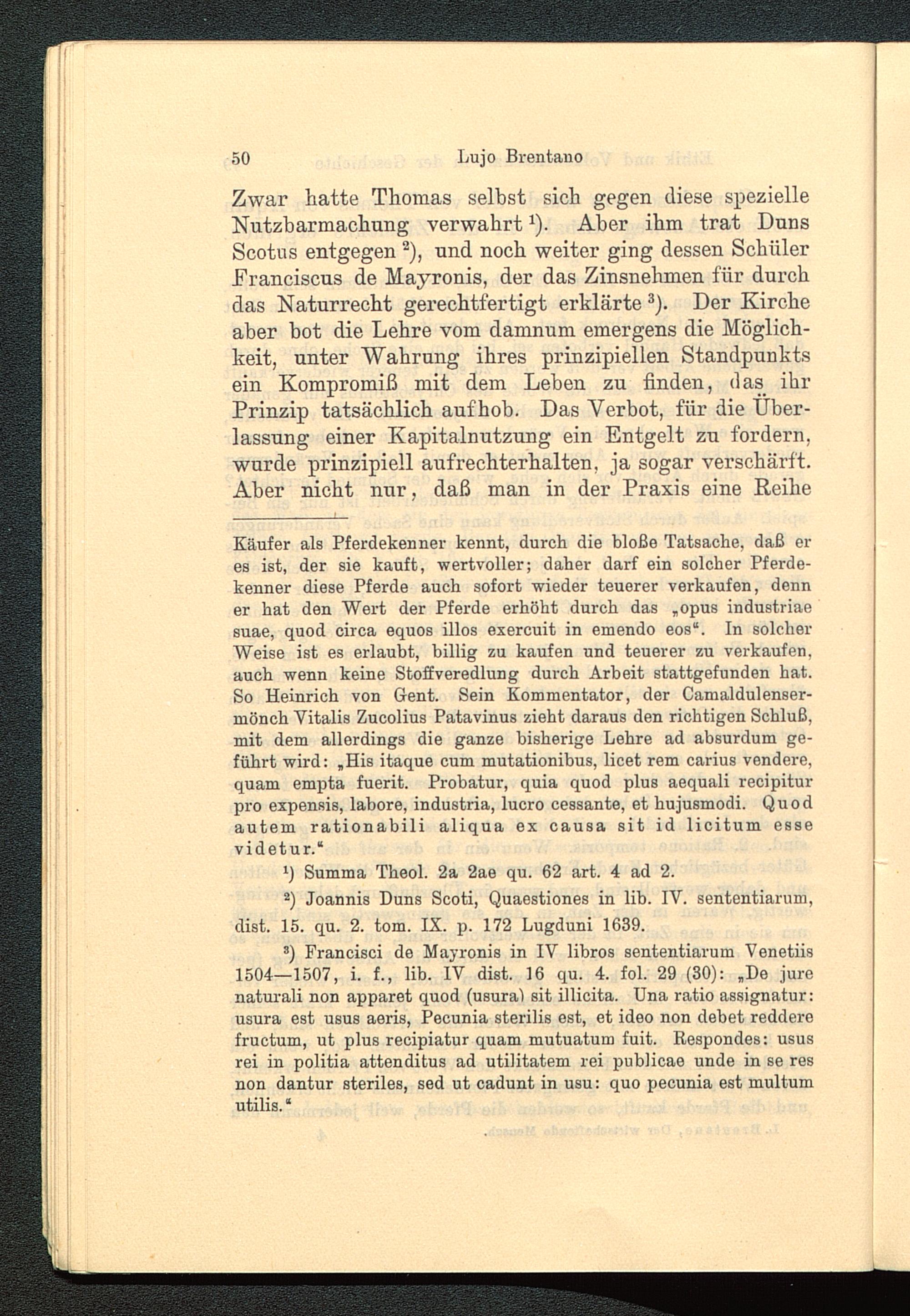 Zwar hatte Thomas seihst sich gegen diese spezielleNutzbarmachung verwahrt 1 ). Aber ihm trat DunsScotus entgegen 2 ), und noch weiter ging dessen SchülerFranciscus de Mayronis, der das Zinsnehmen für durchdas Naturrecht gerechtfertigt erklärte 3 ). Der Kircheaber hot die Lehre vom damnum emergens die Möglich-keit, unter Wahrung ihres prinzipiellen Standpunktsein Kompromiß mit dem Leben zu finden, das ihrPrinzip tatsächlich auf hob. Das Verbot, für die Über-lassung einer Kapitalnutzung ein Entgelt zu fordern,wurde prinzipiell aufrechterhalten, ja sogar verschärft.Aber nicht nur, daß man in der Praxis eine Reihe