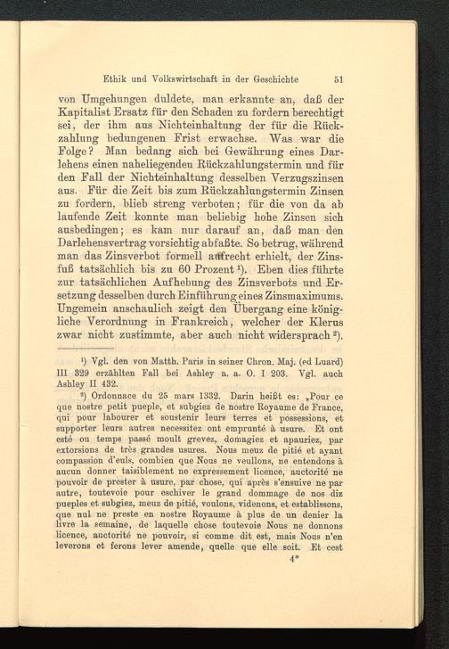 von Umgehungen duldete, man erkannte an, daß derKapitalist Ersatz für den Schaden zu fordern berechtigtsei, der ihm aus Nichteinhaltung der für die Rück-zahlung bedungenen Frist erwachse. Was war dieFolge? Man bedang sich bei Gewährung eines Dar-lehens einen naheliegenden Rückzahlungstermin und fürden Fall der Nichteinhaltung desselben Verzugszinsenaus. Für die Zeit bis zum Rückzahlungstermin Zinsenzu fordern, blieb streng verboten; für die von da ahlaufende Zeit konnte man beliebig hohe Zinsen sichausbedingen; es kam nur darauf an, daß man denDarlehensvertrag vorsichtig abfaßte. So betrug, währendman das Zinsverhot formell aufrecht erhielt, der Zins-fuß tatsächlich bis zu 60 Prozent 1 ). Eben dies führtezur tatsächlichen Aufhebung des Zinsverhots und Er-setzung desselben durch Einführung eines Zinsmaximums.Ungemein anschaulich zeigt den Übergang eine könig-liche Verordnung in Frankreich, welcher der Kleruszwar nicht zustimmte, aber auch nicht widersprach 2 ).
