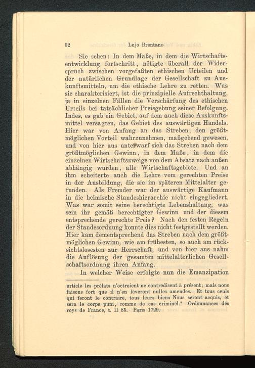 Sie sehen: In dem Maße, in dem die "Wirtschafts-entwicklung fortschritt, nötigte überall der Wider-spruch zwischen vorgefaßten ethischen Urteilen undder natürlichen Grundlage der Gesellschaft zu Aus-kunftsmitteln, um die ethische Lehre zu retten. Wassie charakterisiert, ist die prinzipielle Aufrechthaltung,ja in einzelnen Fällen die Verschärfung des ethischenUrteils hei tatsächlicher Preisgebung seiner Befolgung.Indes, es gab ein Gebiet, auf dem auch diese Auskunfts-mittel versagten, das Gebiet des auswärtigen Handels.Hier war von Anfang an das Streben, den größt-möglichen Vorteil wahrzunehmen, maßgebend gewesen,und von hier aus unterwarf sich das Streben nach demgrößtmöglichen Gewinn, in dem Maße, in dem dieeinzelnen Wirtschaftszweige von dem Absatz nach außenabhängig wurden, alle Wirtschaftsgebiete. Und anihm scheiterte auch die Lehre vom gerechten Preisein der Ausbildung, die sie im späteren Mittelalter ge-funden. Als Fremder war der auswärtige Kaufmannin die heimische Standeshierarchie nicht eingegliedert.Was war somit seine berechtigte Lebenshaltung, wassein ihr gemäß berechtigter Gewinn und der diesementsprechende gerechte Preis ? Nach den festen Regelnder Standesordnung konnte dies nicht festgestellt werden.Hier kam dementsprechend das Streben nach dem größt-möglichen Gewinn, wie am frühesten, so auch am rück-sichtslosesten zur Herrschaft, und von hier aus nahmdie Auflösung der gesamten mittelalterlichen Gesell-schaftsordnung ihren Anfang.
