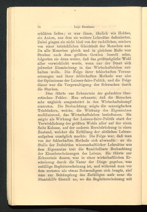Dies führte zur Erkenntnis der gedachten theo-retischen Fehler. Man erkannte, daß die Menschensehr ungleich ausgestattet in den Wirtschaftskampfeintreten. Die Beobachtung zeigte die mannigfachenTriebfedern, welche, die Wirkung des Eigennutzesmodifizierend, das Wirtschaftsleben beeinflussen. Siezeigte als Wirkung der Laissez-faire-Politik statt derVerwirklichung des größten Wohls aller auf der einenSeite Kolosse, auf der anderen Herabdrückung in einenZustand, welcher die Erfüllung der sittlichen Lebens-aufgaben unmöglich machte. Die Folge war, daß manvon der fehlerhaften Methode sich abwandte: an dieStelle der Deduktion wissenschaftlicher Lehrsätze ausdem Eigennutze trat die Unmittelbare Beobachtungder Einzelerscheinungen des Lehens. Sie führte zurErkenntnis dessen, was in einer wirtschaftlichen Er-scheinung durch die Natur der Dinge gegeben, waszufällige Begleiterscheinung ist, und während man vordem ersteren als etwas Notwendigem sich beugte, riefman zur Bekämpfung des Zufälligen aufs neue dieStaatshilfe überall an, wo die Begleiterscheinung mit