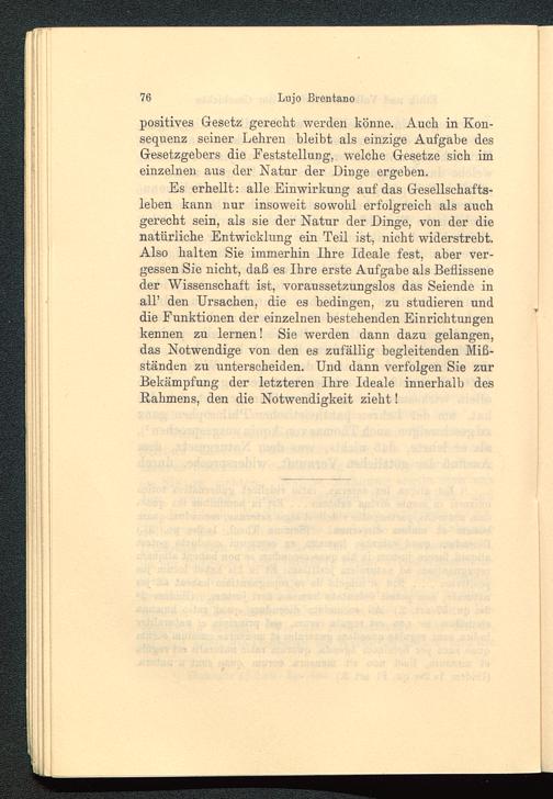 Es erhellt: alle Einwirkung auf das Gesellschafts-leben kann nur insoweit sowohl erfolgreich als auchgerecht sein, als sie der Natur der Dinge, von der dienatürliche Entwicklung ein Teil ist, nicht widerstrebt.Also halten Sie immerhin Ihre Ideale fest, aber ver-gessen Sie nicht, daß es Ihre erste Aufgabe als Beflisseneder Wissenschaft ist, voraussetzungslos das Seiende inall’ den Ursachen, die es bedingen, zu studieren unddie Funktionen der einzelnen bestehenden Einrichtungenkennen zu lernen! Sie werden dann dazu gelangen,das Notwendige von den es zufällig begleitenden Miß-ständen zu unterscheiden. Und dann verfolgen Sie zurBekämpfung der letzteren Ihre Ideale innerhalb desRahmens, den die Notwendigkeit zieht!