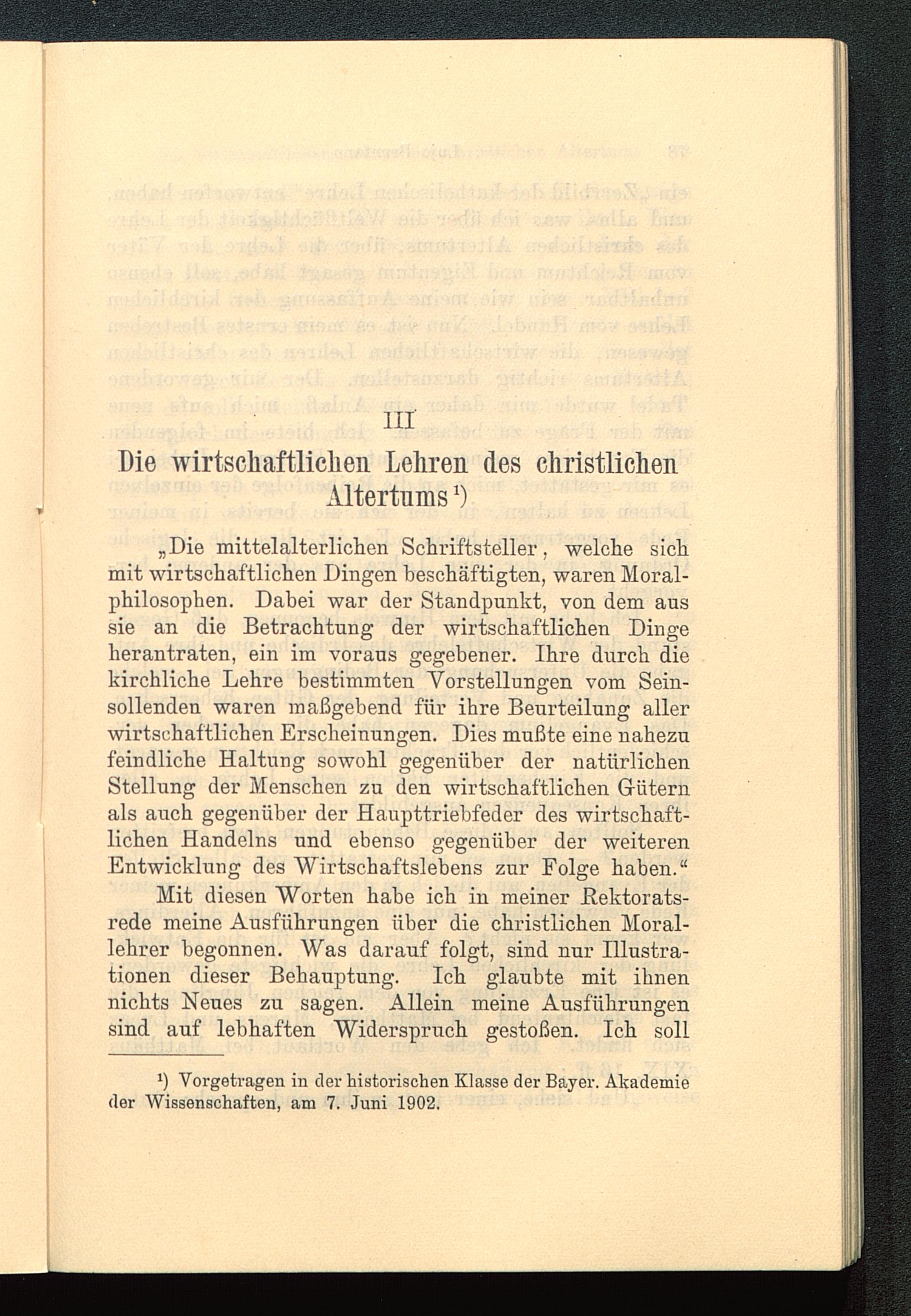 „Die mittelalterlichen Schriftsteller, welche sichmit wirtschaftlichen Dingen beschäftigten, waren Moral-philosophen. Dabei war der Standpunkt, von dem aussie an die Betrachtung der wirtschaftlichen Dingeherantraten, ein im voraus gegebener. Ihre durch diekirchliche Lehre bestimmten Vorstellungen vom Sein-sollenden waren maßgebend für ihre Beurteilung allerwirtschaftlichen Erscheinungen. Dies mußte eine nahezufeindliche Haltung sowohl gegenüber der natürlichenStellung der Menschen zu den wirtschaftlichen Güternals auch gegenüber der Haupttriebfeder des wirtschaft-lichen Handelns und ebenso gegenüber der weiterenEntwicklung des Wirtschaftslebens zur Folge haben.“Mit diesen Worten habe ich in meiner .Rektorats-rede meine Ausführungen über die christlichen Moral-lehrer begonnen. Was darauf folgt, sind nur Illustra-tionen dieser Behauptung. Ich glaubte mit ihnennichts Neues zu sagen. Allein meine Ausführungensind auf lebhaften Widerspruch gestoßen. Ich soll