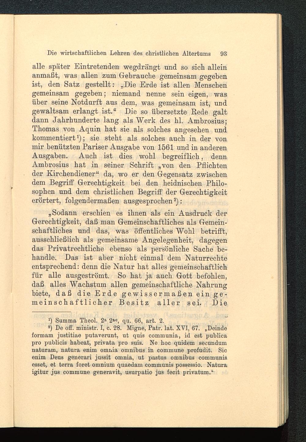alle später Eintretenden wegdrängt und so sich alleinanmaßt, was allen zum Gebrauche gemeinsam gegebenist, den Satz gestellt: „Die Erde ist allen Menschengemeinsam gegeben; niemand nenne sein eigen, wasüber seine Notdurft aus dem, was gemeinsam ist, undgewaltsam erlangt ist.“ Die so übersetzte Rede galtdann Jahrhunderte lang als Werk des hl. Ambrosius;Thomas von Aquin hat sie als solches angesehen undkommentiert ‘); sie steht als solches auch in der vonmir benützten Pariser Ausgabe von 1561 und in anderenAusgaben. Auch ist dies wohl begreiflich, dennAmbrosius hat in seiner Schrift „von den Pflichtender Kirchendiener“ da, wo er den Gegensatz zwischendem Begriff Gerechtigkeit bei den heidnischen Philo-sophen und dem christlichen Begriff der Gerechtigkeiterörtert, folgendermaßen ausgesprochen 2 ):