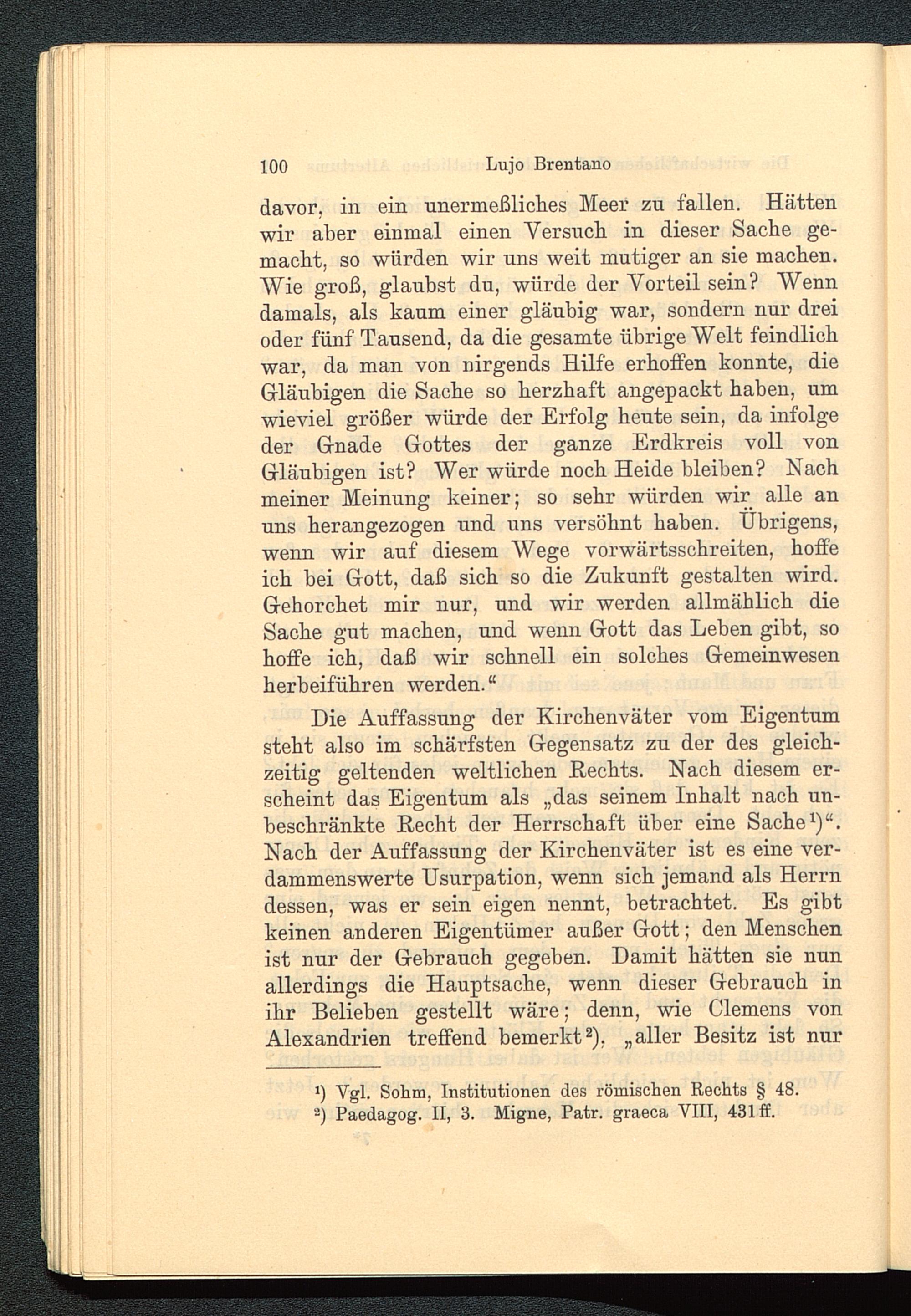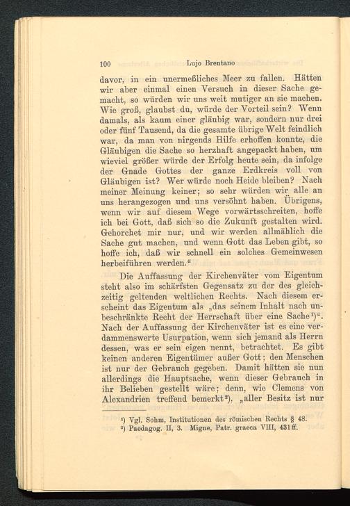 Die Auffassung der Kirchenväter vom Eigentumsteht also im schärfsten Gegensatz zu der des gleich-zeitig geltenden weltlichen Hechts. Nach diesem er-scheint das Eigentum als „das seinem Inhalt nach un-beschränkte Recht der Herrschaft über eine Sache 1 )“.Nach der Auffassung der Kirchenväter ist es eine ver-dammenswerte Usurpation, wenn sich jemand als Herrndessen, was er sein eigen nennt, betrachtet. Es gibtkeinen anderen Eigentümer außer Gott ; den Menschenist nur der Gebrauch gegeben. Damit hätten sie nunallerdings die Hauptsache, wenn dieser Gebrauch inihr Belieben gestellt wäre; denn, wie Clemens vonAlexandrien treffend bemerkt 2 ), „aller Besitz ist nur