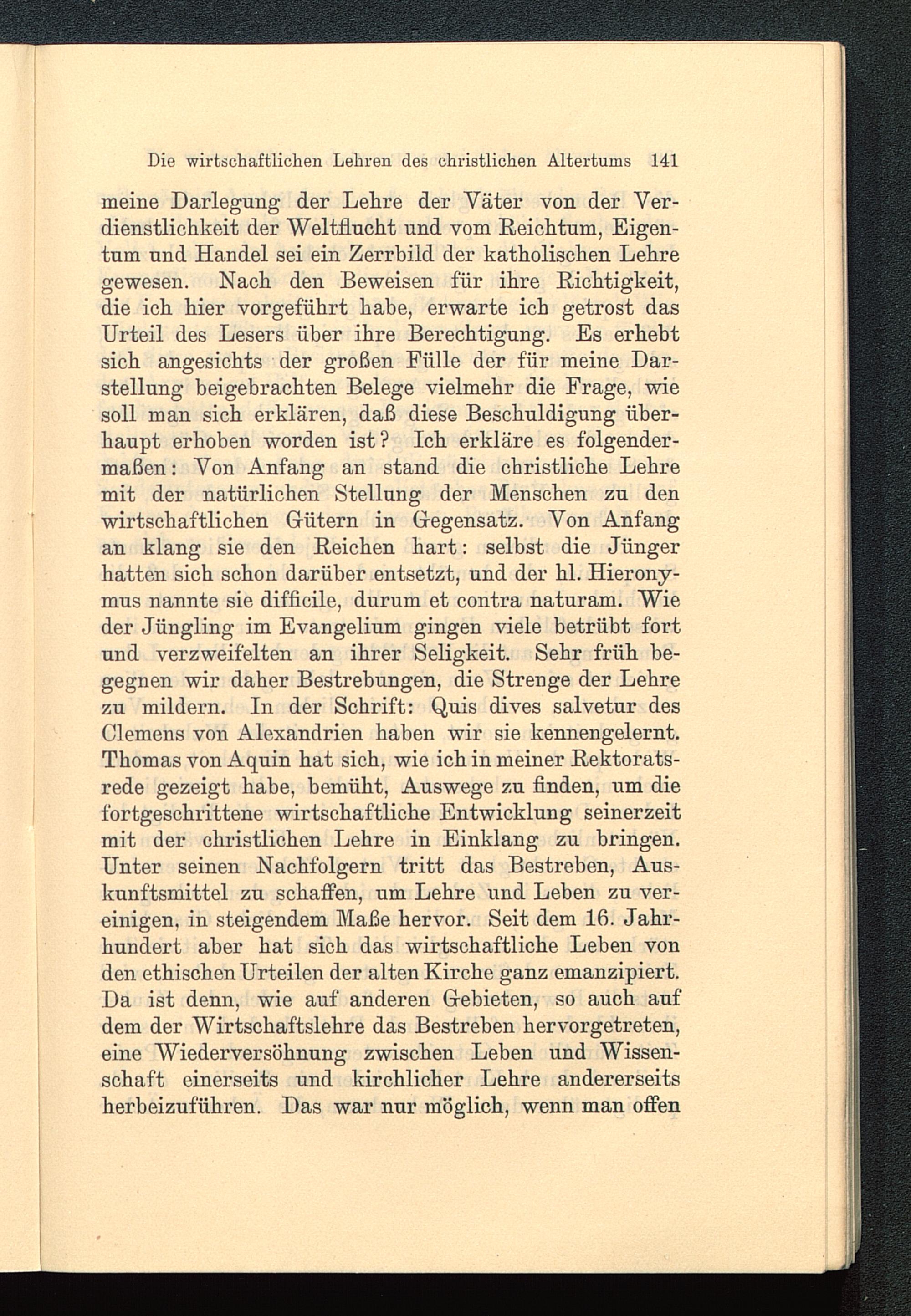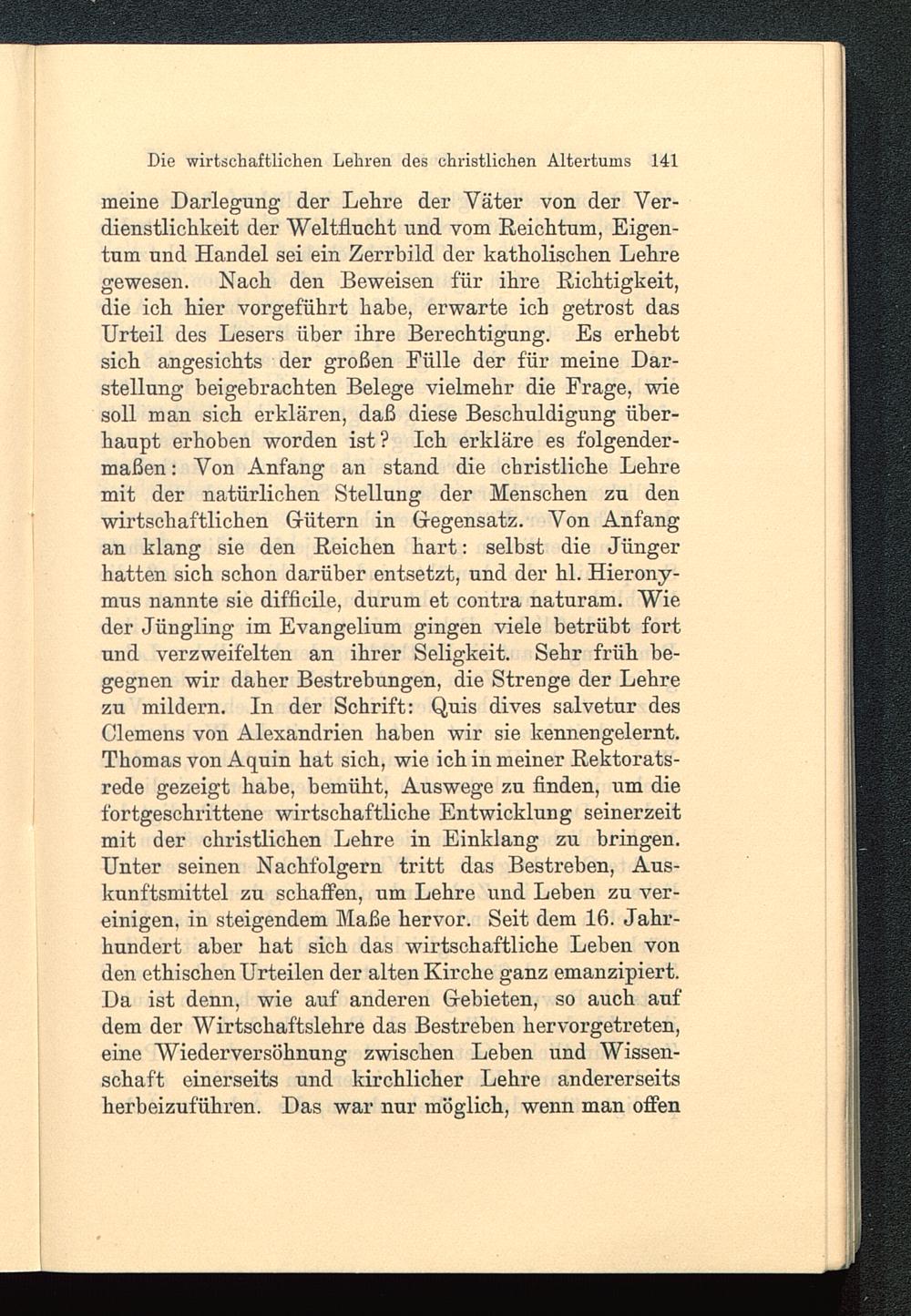 meine Darlegung der Lehre der Yäter von der Ver-dienstlichkeit der Weltflucht und vom Reichtum, Eigen-tum und Handel sei ein Zerrbild der katholischen Lehregewesen. Nach den Beweisen für ihre Richtigkeit,die ich hier vorgeführt habe, erwarte ich getrost dasUrteil des Lesers über ihre Berechtigung. Es erhebtsich angesichts der großen Fülle der für meine Dar-stellung beigebrachten Belege vielmehr die Frage, wiesoll man sich erklären, daß diese Beschuldigung über-haupt erhoben worden ist? Ich erkläre es folgender-maßen: Von Anfang an stand die christliche Lehremit der natürlichen Stellung der Menschen zu denwirtschaftlichen Gütern in Gegensatz. Von Anfangan klang sie den Reichen hart: selbst die Jüngerhatten sich schon darüber entsetzt, und der hl. Hierony-mus nannte sie difficile, durum et contra naturam. Wieder Jüngling im Evangelium gingen viele betrübt fortund verzweifelten an ihrer Seligkeit. Sehr früh be-gegnen wir daher Bestrebungen, die Strenge der Lehrezu mildern. In der Schrift: Quis dives salvetur desClemens von Alexandrien haben wir sie kennengelernt.Thomas von Aquin hat sich, wie ich in meiner Rektorats-rede gezeigt habe, bemüht, Auswege zu finden, um diefortgeschrittene wirtschaftliche Entwicklung seinerzeitmit der christlichen Lehre in Einklang zu bringen.Unter seinen Nachfolgern tritt das Bestreben, Aus-kunftsmittel zu schaffen, um Lehre und Leben zu ver-einigen, in steigendem Maße hervor. Seit dem 16. Jahr-hundert aber hat sich das wirtschaftliche Leben vonden ethischen Urteilen der alten Kirche ganz emanzipiert.Da ist denn, wie auf anderen Gebieten, so auch aufdem der Wirtschaftslehre das Bestreben hervorgetreten,eine Wiederversöhnung zwischen Leben und Wissen-schaft einerseits und kirchlicher Lehre andererseitsherbeizuführen. Das war nur möglich, wenn man offen