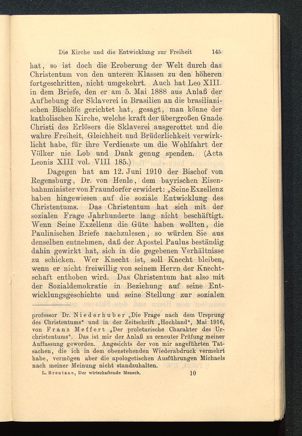 hat, so ist doch die Eroberung der Welt durch dasChristentum von den unteren Klassen zu den höherenfortgeschritten, nicht umgekehrt. Auch hat Leo XIII. in dem Briefe, den er am 5. Mai 1888 aus Anlaß derAufhebung der Sklaverei in Brasilien an die brasiliani-schen Bischöfe gerichtet hat, gesagt, man könne derkatholischen Kirche , welche kraft der übergroßen GnadeChristi des Erlösers die Sklaverei ausgerottet und diewahre Freiheit, Gleichheit und Brüderlichkeit verwirk-licht habe, für ihre Verdienste um die Wohlfahrt derVölker nie Loh und Dank genug spenden. (ActaLeonis XIII vol. VIII 185.)