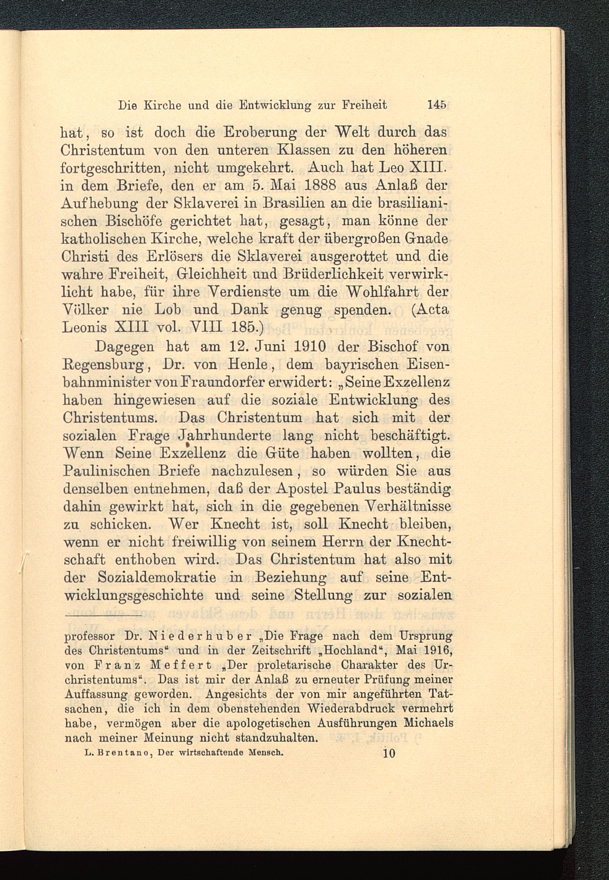 Dagegen hat am 12. Juni 1910 der Bischof vonRegensburg , Dr. von Henle, dem bayrischen Eisen-bahnminister von Fraundorfer erwidert: „ Seine Exzellenzhaben hingewiesen auf die soziale Entwicklung desChristentums. Das Christentum hat sich mit dersozialen Frage Jahrhunderte lang nicht beschäftigt.Wenn Seine Exzellenz die Güte haben wollten, diePaulinischen Briefe nachzulesen, so würden Sie ausdenselben entnehmen, daß der Apostel Paulus beständigdahin gewirkt hat, sich in die gegebenen Verhältnissezu schicken. Wer Knecht ist, soll Knecht bleiben,wenn er nicht freiwillig von seinem Herrn der Knecht-schaft enthoben wird. Das Christentum hat also mitder Sozialdemokratie in Beziehung auf seine Ent-wicklungsgeschichte und seine Stellung zur sozialen