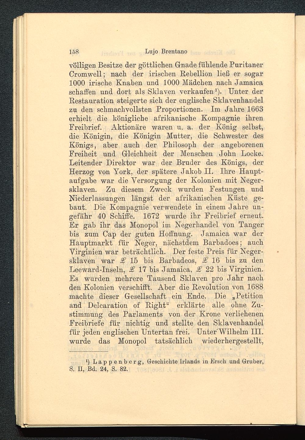 völligen Besitze der göttlichen Gnade fühlende PuritanerCromwell; nach der irischen Rebellion ließ er sogar1000 irische Knaben und 1000 Mädchen nach Jamaica schaffen und dort als Sklaven verkaufen 1 ). Unter derRestauration steigerte sich der englische Sklavenhandelzu den schmachvollsten Proportionen. Im Jahre 1663erhielt die königliche afrikanische Kompagnie ihrenFreibrief. Aktionäre waren u. a. der König seihst,die Königin, die Königin Mutter, die Schwester desKönigs, aber auch der Philosoph der angeborenenFreiheit und Gleichheit der Menschen John Locke .Leitender Direktor war der Bruder des Königs, derHerzog von York, der spätere Jakob II. Ihre Haupt-aufgabe war die Versorgung der Kolonien mit Neger-sklaven. Zu diesem Zweck wurden Festungen undNiederlassungen längst der afrikanischen Küste ge-baut. Die Kompagnie verwendete in einem J ahre un-gefähr 40 Schiffe. 1672 wurde ihr Freibrief erneut.Er gab ihr das Monopol im Negerhandel von Tanger bis zum Cap der guten Hoffnung. Jamaica war derHauptmarkt für Neger, nächstdem Barbadoes; auchVirginien war beträchtlich. Der feste Preis für Neger-sklaven war £ 15 bis Barbadeos, £ 16 bis zu denLeeward-Inseln, £ 17 bis Jamaica, £ 22 bis Virginien.Es wurden mehrere Tausend Sklaven pro Jahr nachden Kolonien verschifft. Aber die Revolution von 1688machte dieser Gesellschaft ein Ende. Die „Petitionand Delcaration of Right“ erklärte alle ohne Zu-stimmung des Parlaments von der Krone verliehenenFreibriefe für nichtig und stellte den Sklavenhandelfür jeden englischen Untertan frei. Unter'Wilhelm III. wurde das Monopol tatsächlich wiederhergestellt,