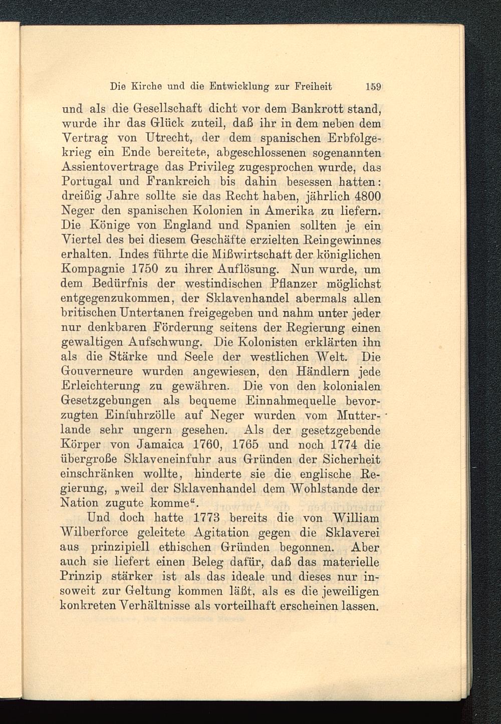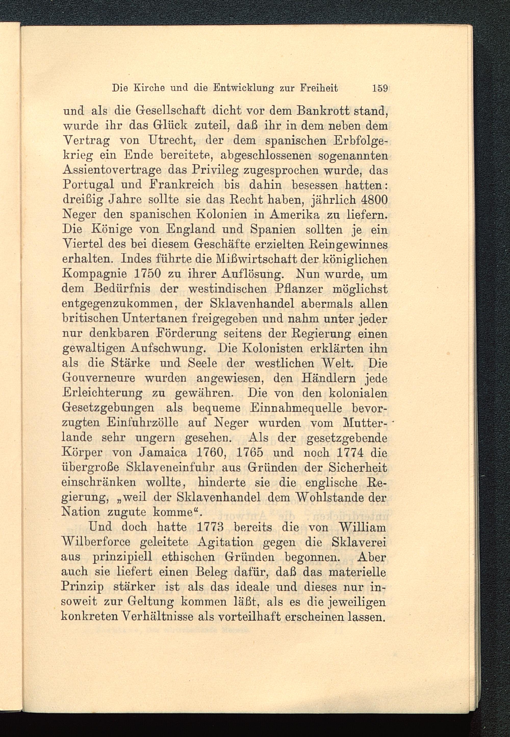 Und doch hatte 1778 bereits die von WilliamWilberforce geleitete Agitation gegen die Sklavereiaus prinzipiell ethischen Gründen begonnen. Aberauch sie liefert einen Beleg dafür, daß das materiellePrinzip stärker ist als das ideale und dieses nur in-soweit zur Geltung kommen läßt, als es die jeweiligenkonkreten Verhältnisse als vorteilhaft erscheinen lassen.