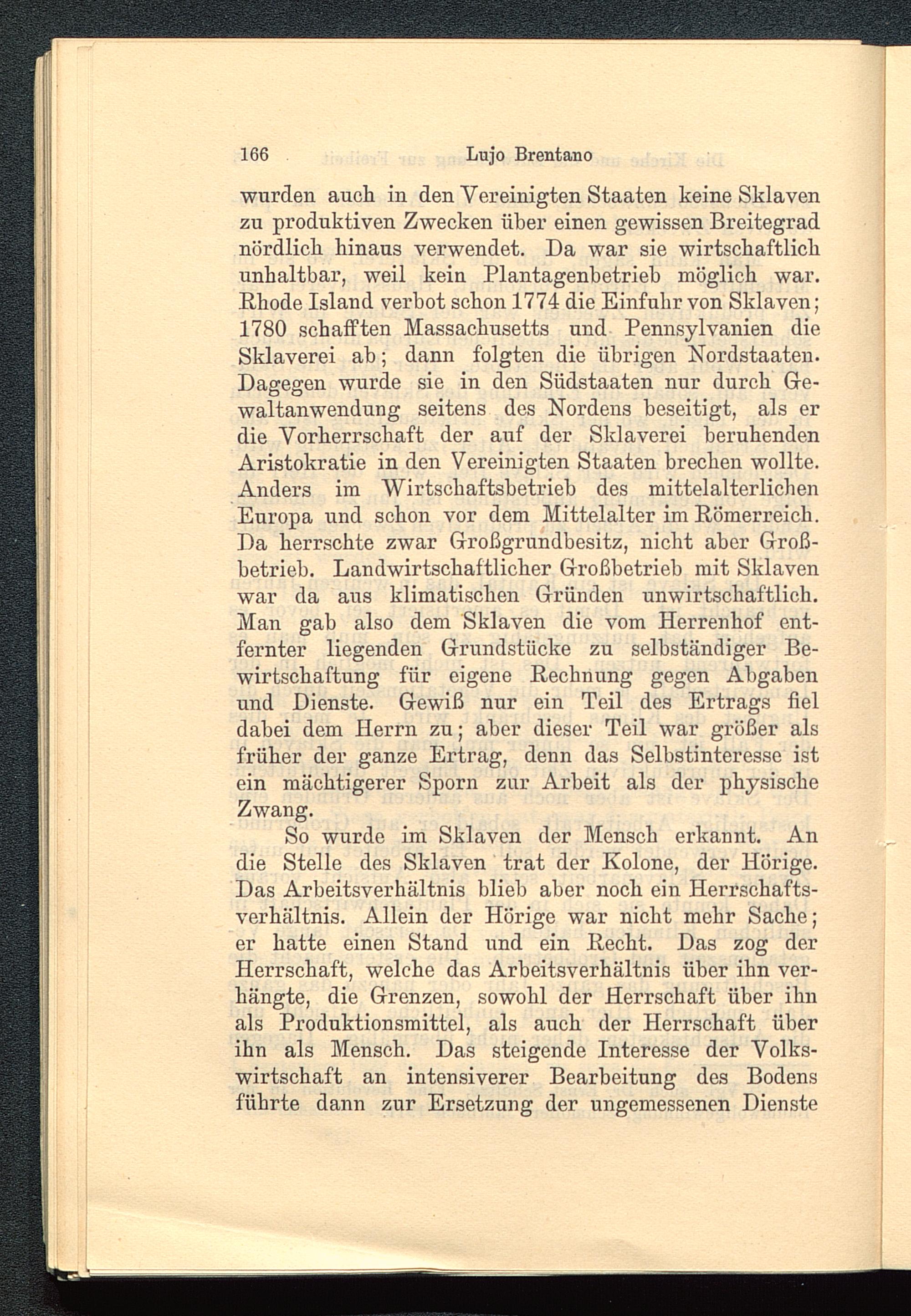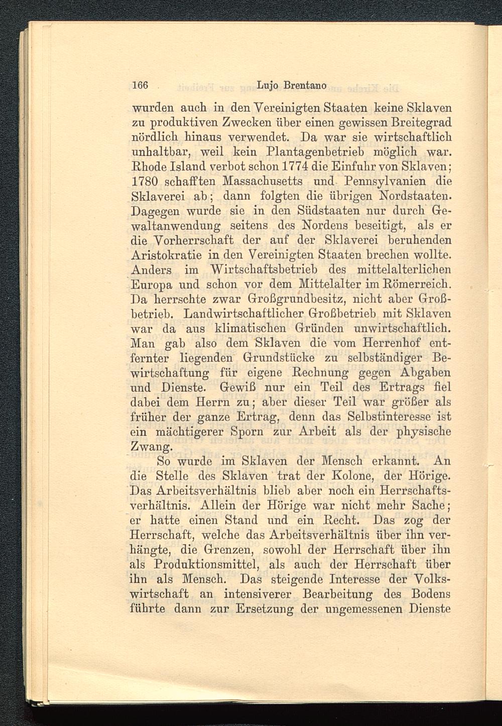 wurden auch in den Vereinigten Staaten keine Sklavenzu produktiven Zwecken über einen gewissen Breitegradnördlich hinaus verwendet. Da war sie wirtschaftlichunhaltbar, weil kein Plantagenbetrieb möglich war.Rhode Island verbot schon 1774 die Einfuhr von Sklaven;1780 schafften Massachusetts und Pennsylvanien dieSklaverei ab; dann folgten die übrigen Kordstaaten.Dagegen wurde sie in den Südstaaten nur durch Ge-waltanwendung seitens des Nordens beseitigt, als erdie Vorherrschaft der auf der Sklaverei beruhendenAristokratie in den Vereinigten Staaten brechen wollte.Anders im Wirtschaftsbetrieb des mittelalterlichenEuropa und schon vor dem Mittelalter im Römerreich.Da herrschte zwar Großgrundbesitz, nicht aber Groß-betrieb. Landwirtschaftlicher Großbetrieb mit Sklavenwar da aus klimatischen Gründen unwirtschaftlich.Man gab also dem Sklaven die vom Herrenhof ent-fernter liegenden Grundstücke zu selbständiger Be-wirtschaftung für eigene Rechnung gegen Abgabenund Dienste. Gewiß nur ein Teil des Ertrags fieldabei dem Herrn zu; aber dieser Teil war größer alsfrüher der ganze Ertrag, denn das Selbstinteresse istein mächtigerer Sporn zur Arbeit als der physischeZwang.